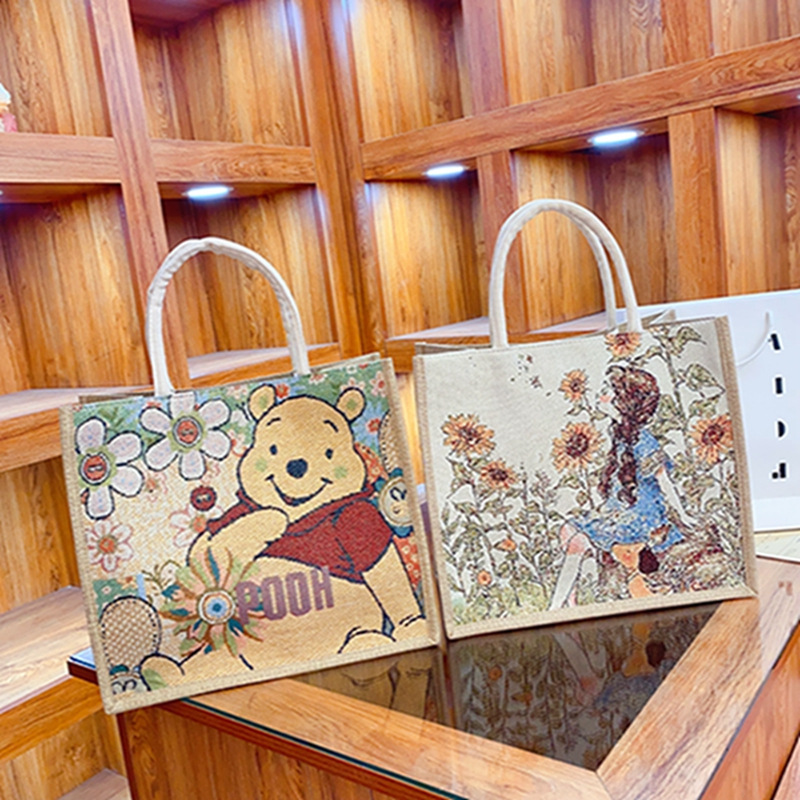 リネン製トートバッグ、金糸ジャカード刺繍、キュートな漫画柄ハンドバッグ、シンプルで爽やかな大容量バッグ、レディースバッグ