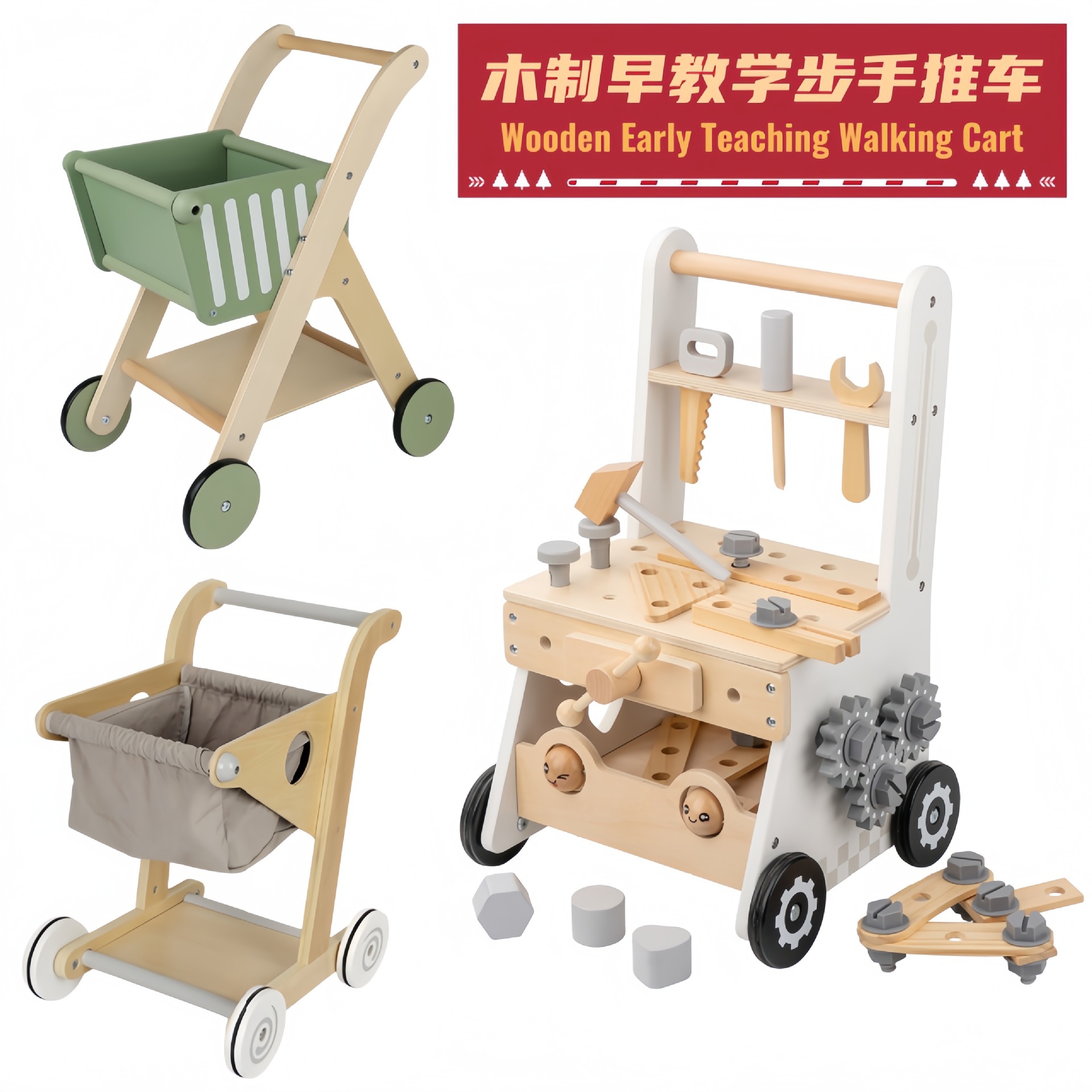 跨境木制婴儿仿真购物车益智学步过家家手推工具车木质儿童玩具