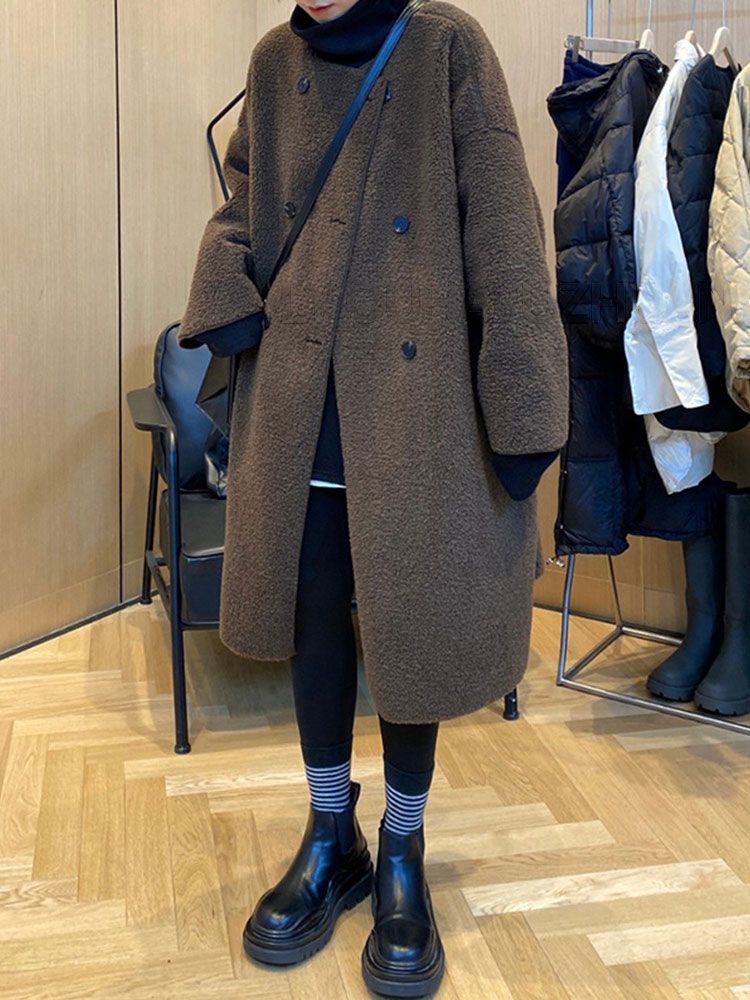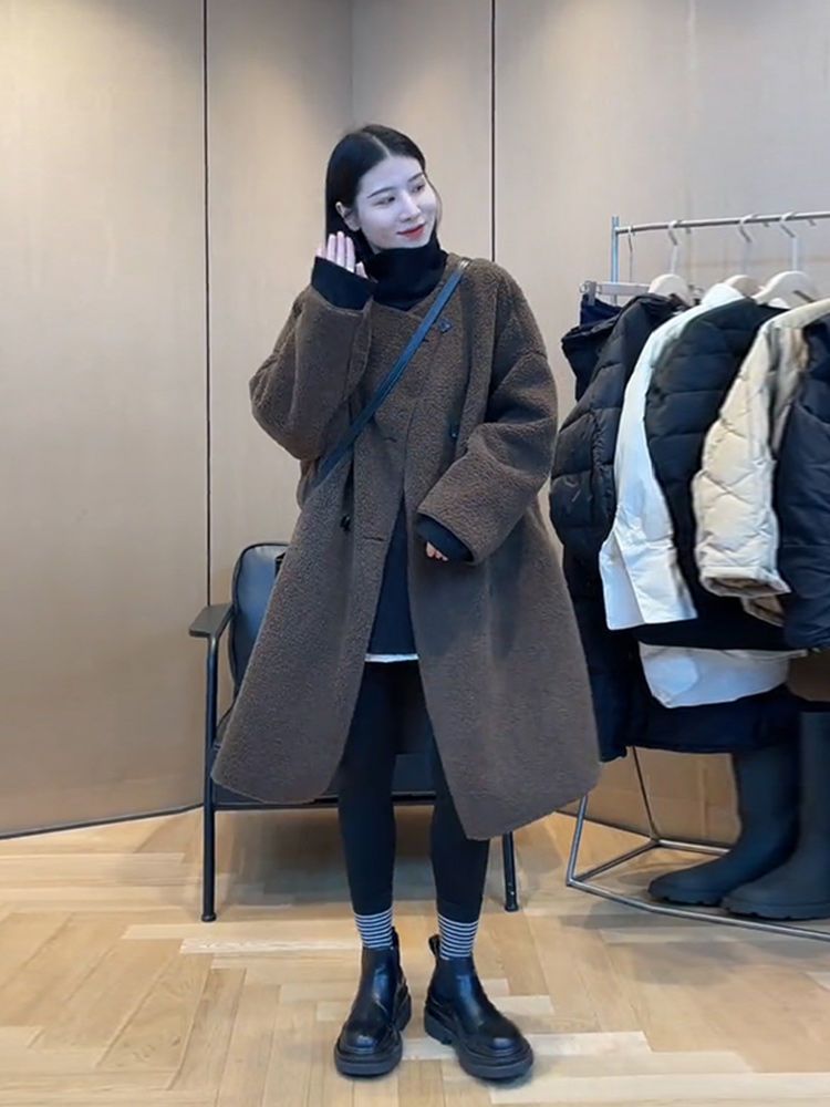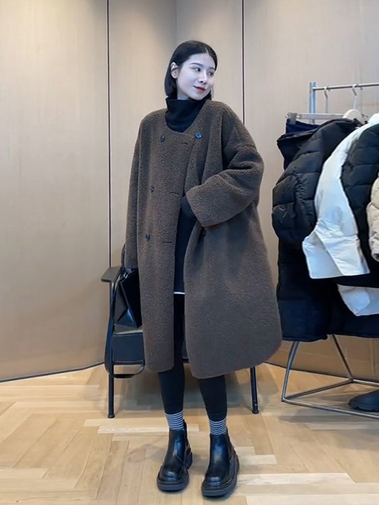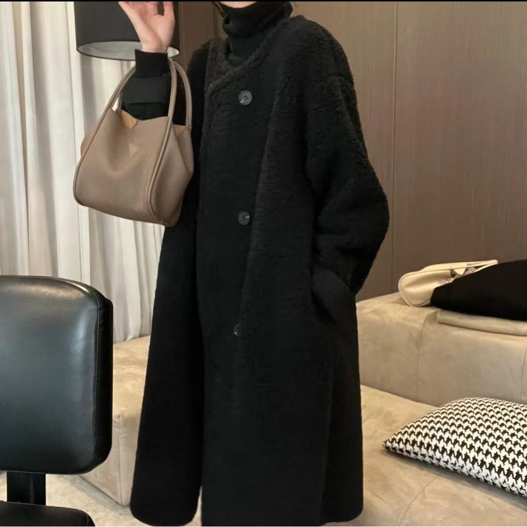 毛皮の一体ダブルボタンの羊の小毛のコートの女性の2024秋冬の怠惰な風の厚い中の長いタイプのフリースの綿服