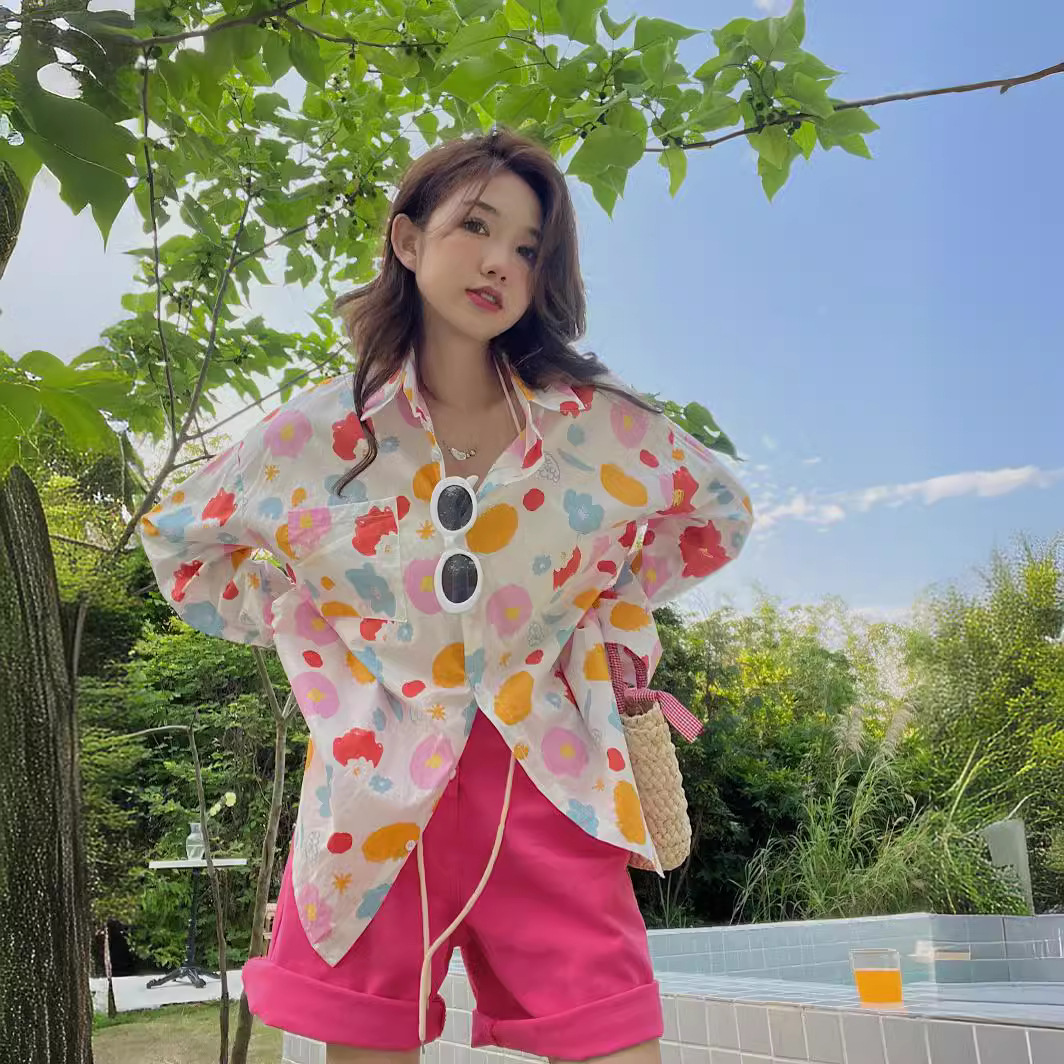 甘い花のシャツの女性の夏はゆったりとしていて、痩せています。