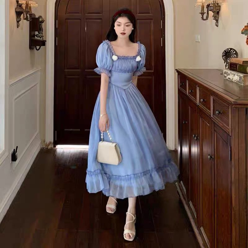 フランスの青い泡の袖のワンピースの夏は逃げます。