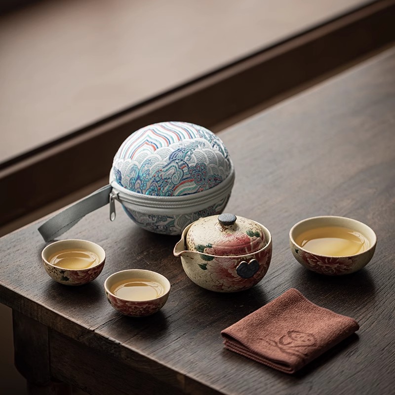 青花旅行茶器セットポータブルティーポット工夫カップ茶盤屋外キャンプ高級プレゼント