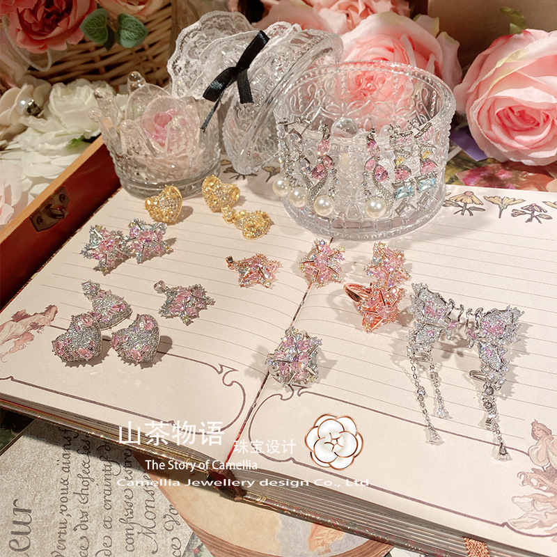 山茶璀璨大方瑞丽耳钉流星戒指套装女 不规则满钻樱花粉爱心吊坠