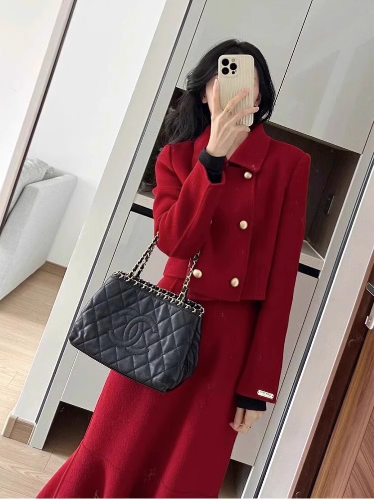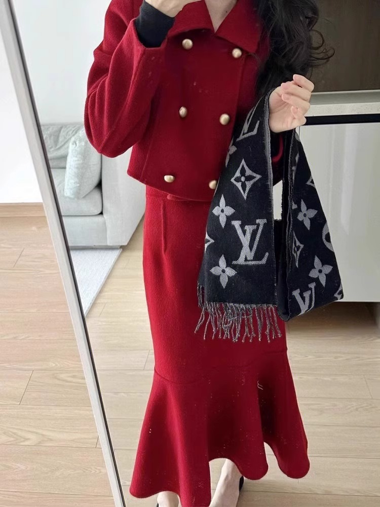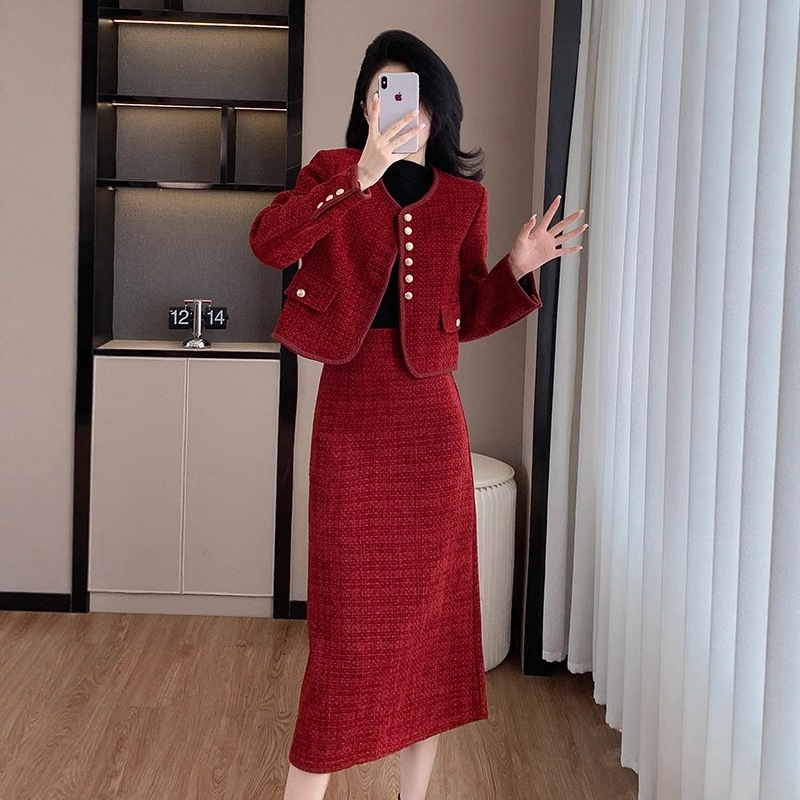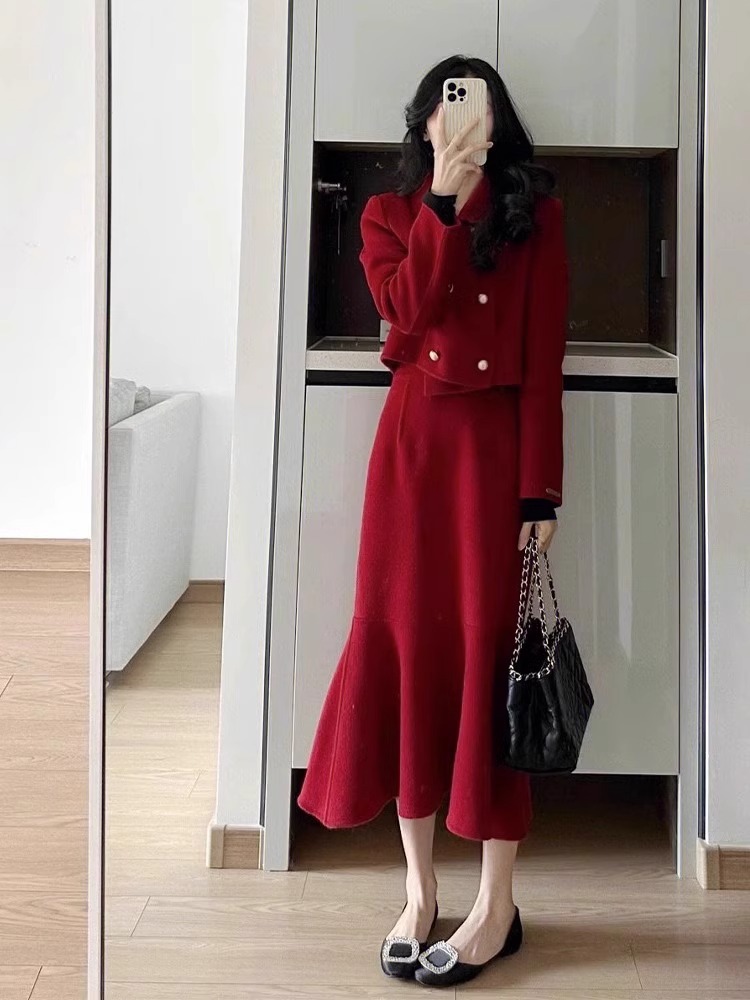 秋冬新作ウールスーツ2025韓国風スリムフィットショートジャケットとヒップスカートのツーピースセット、新年の赤い帰省服