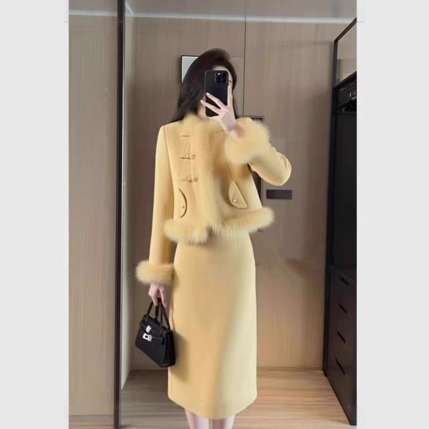 巨好看秋冬款一整套大方得体气质小香风黄色毛呢外套半身裙套装厚