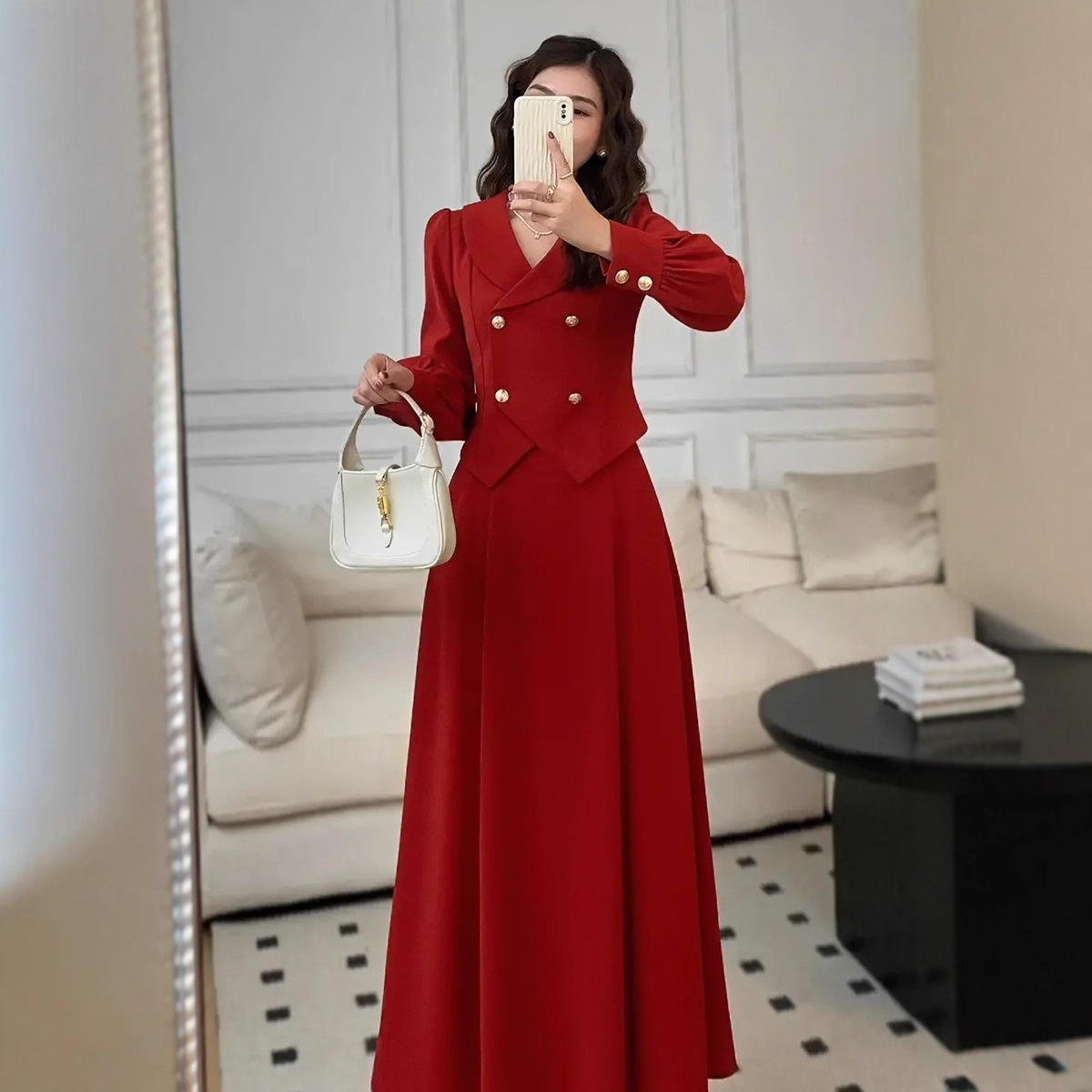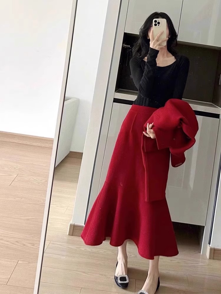 2025红色长裙小香风套装女设计感秋冬结婚喜庆中长款半身裙两件套