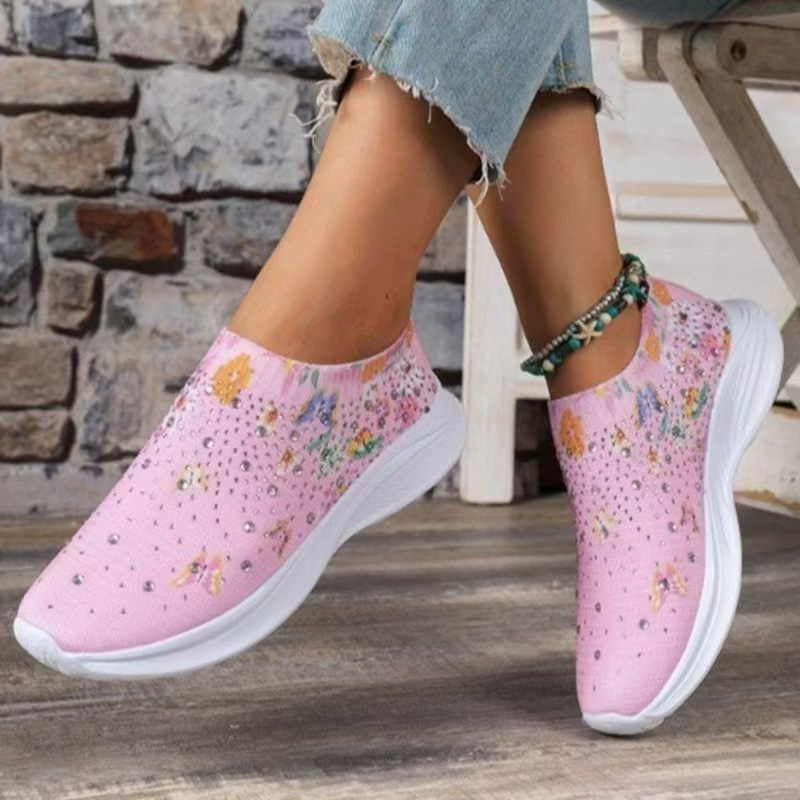 跨境女鞋2023透气运动休闲单鞋水钻蝴蝶飞织鞋厚底跑步鞋休闲百搭