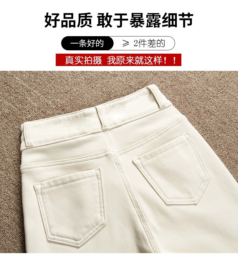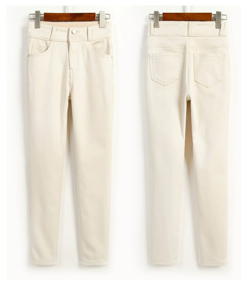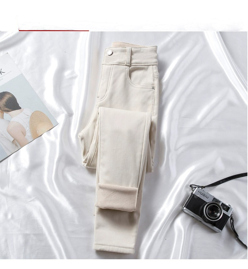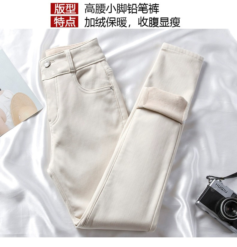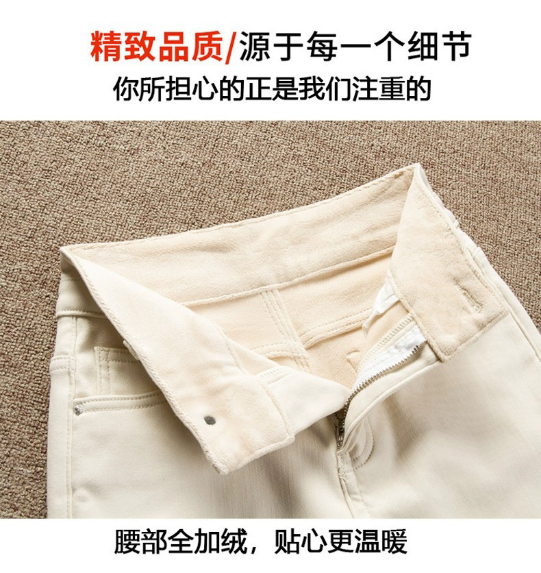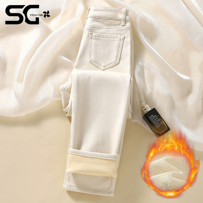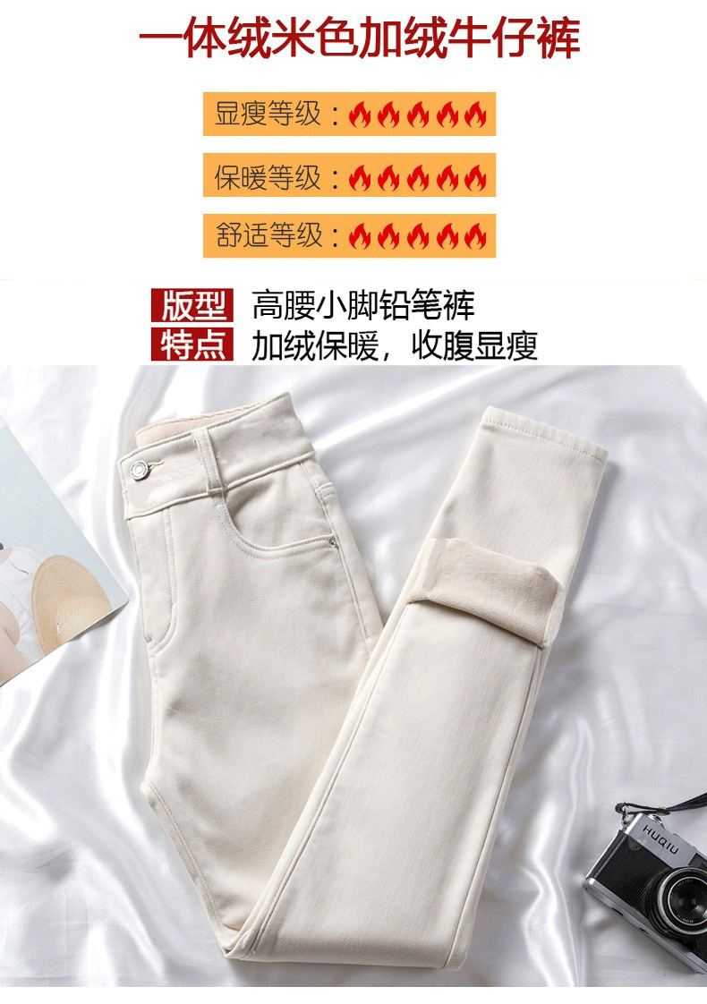 米白色のレディースジーンズ、2025年冬、裏起毛・厚手、ハイウエスト、スリムフィット、伸縮性、ペンシルパンツ