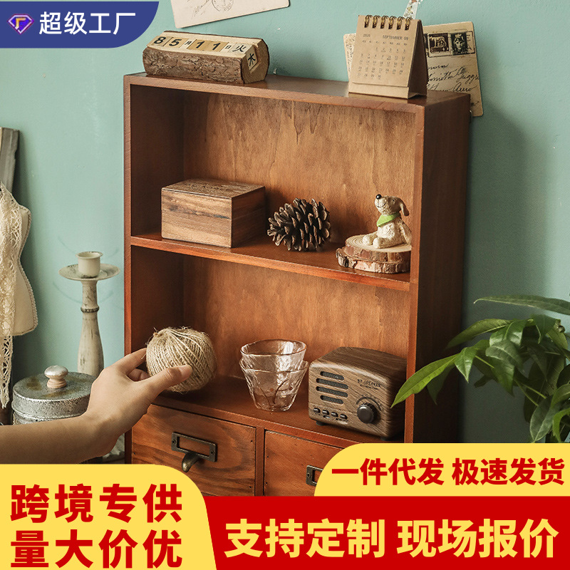 デスクトップ収纳ボックスデスクザ食器棚引き出し式レトロコップ化粧品棚卓上木制