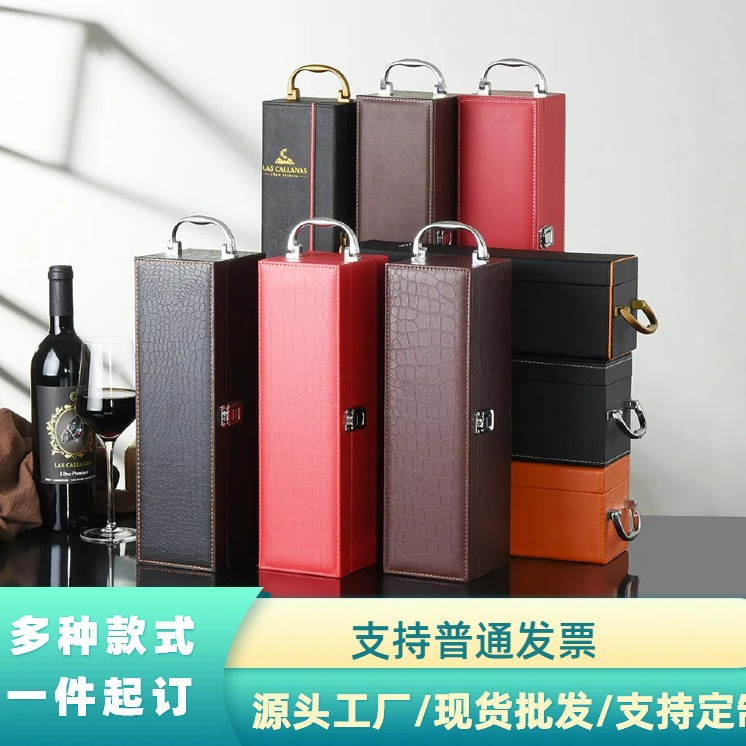 革製箱包装メーカー、既製品にロゴ印刷、単品ワイン用箱、持ち運び可能な単品赤ワインギフトボックス包装箱