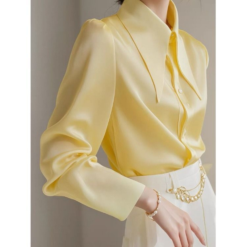 今年流行漂亮小衫气质黄色衬衫女早秋醋酸缎面感上衣