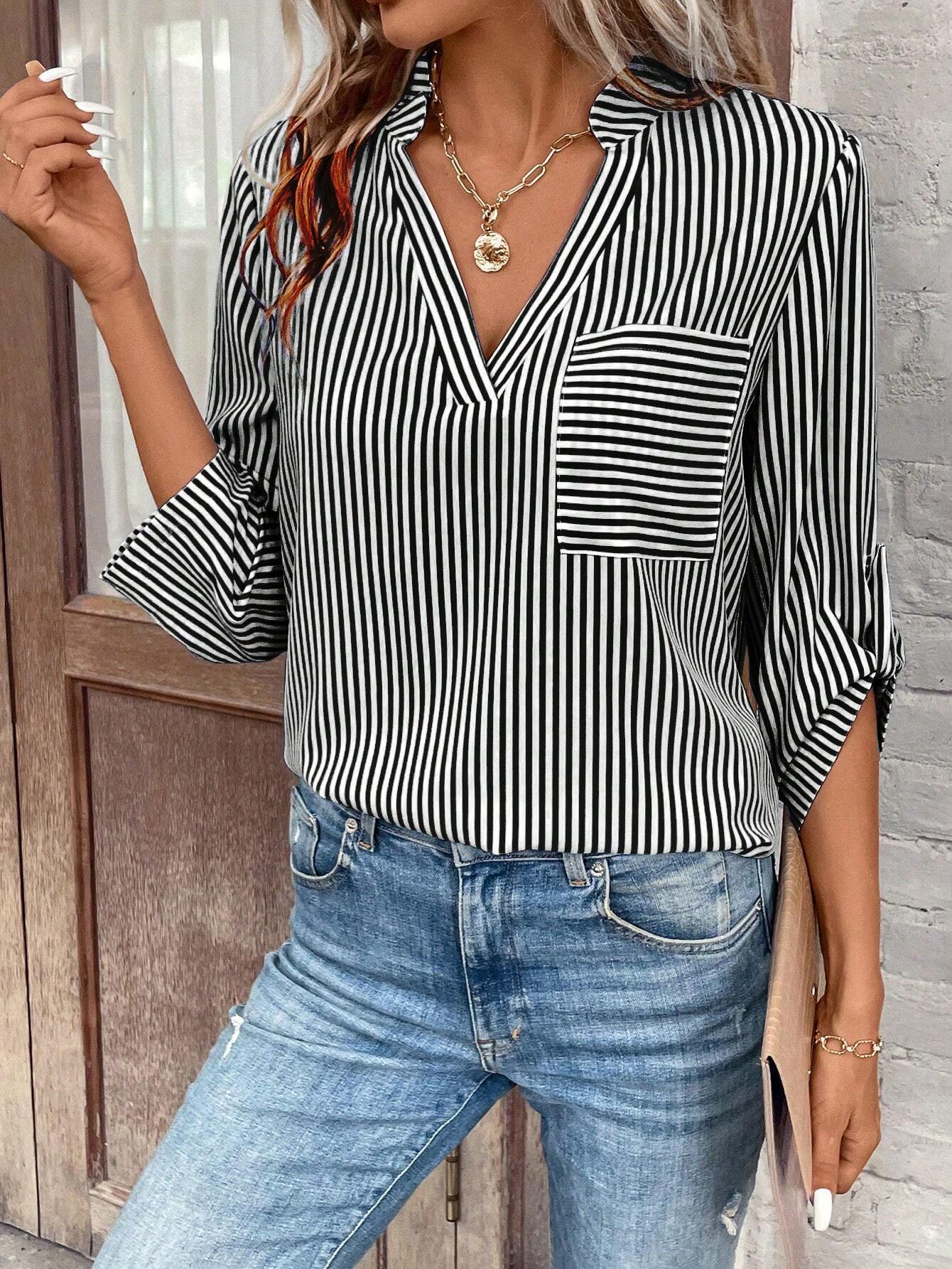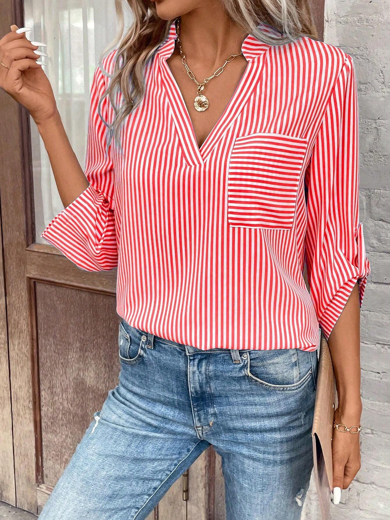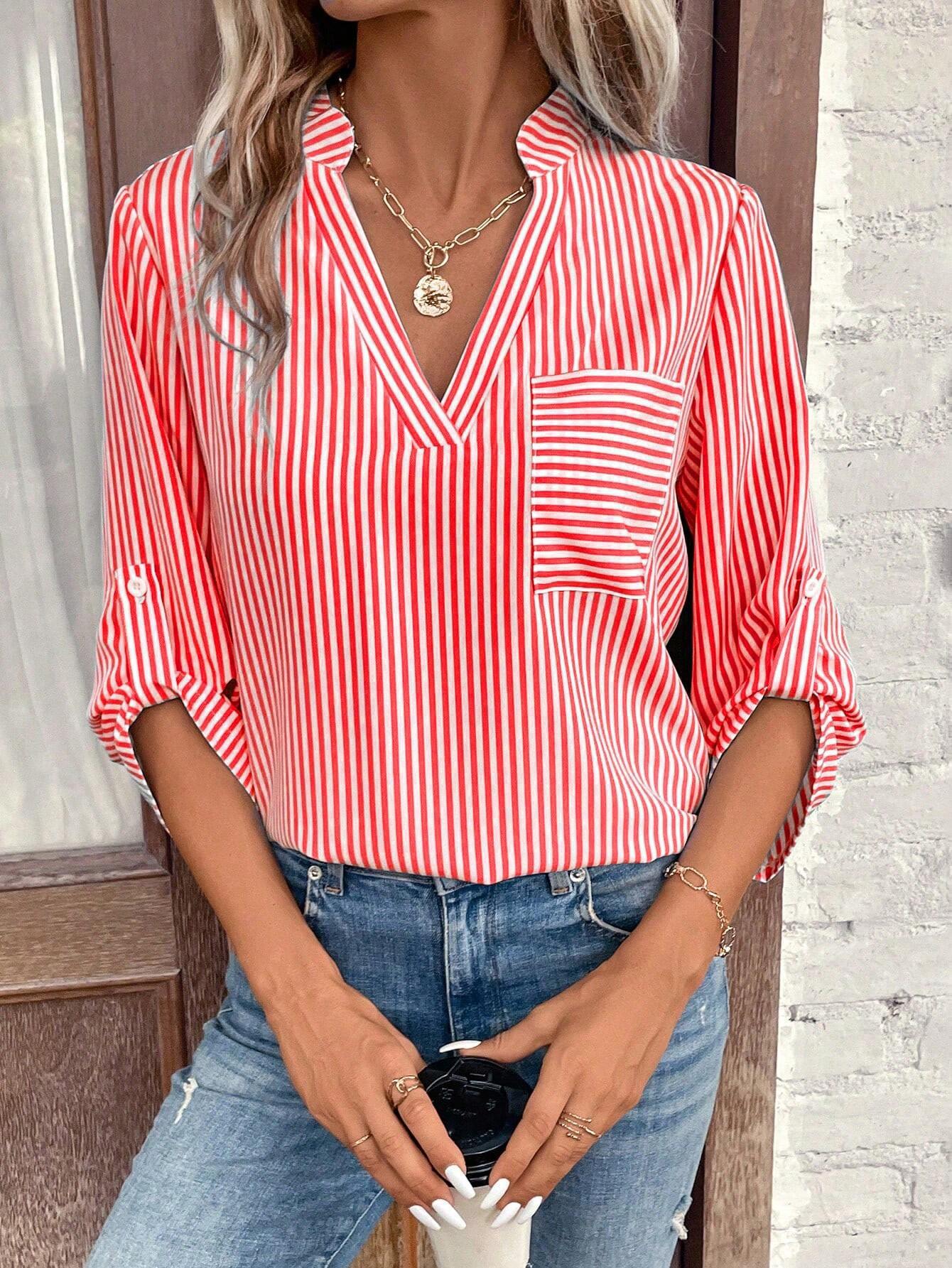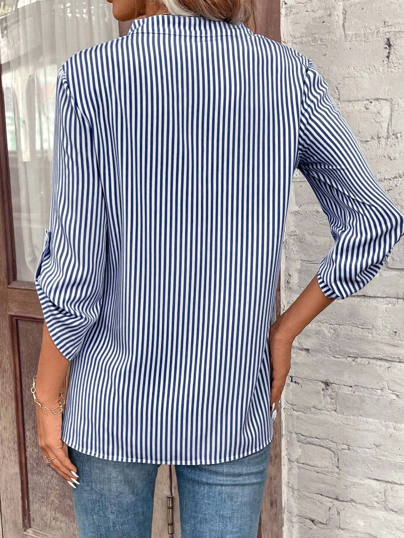 2025年欧米新作アマゾンVネックプルオーバーストライププリントボタン付き長袖カジュアルレディースシャツ