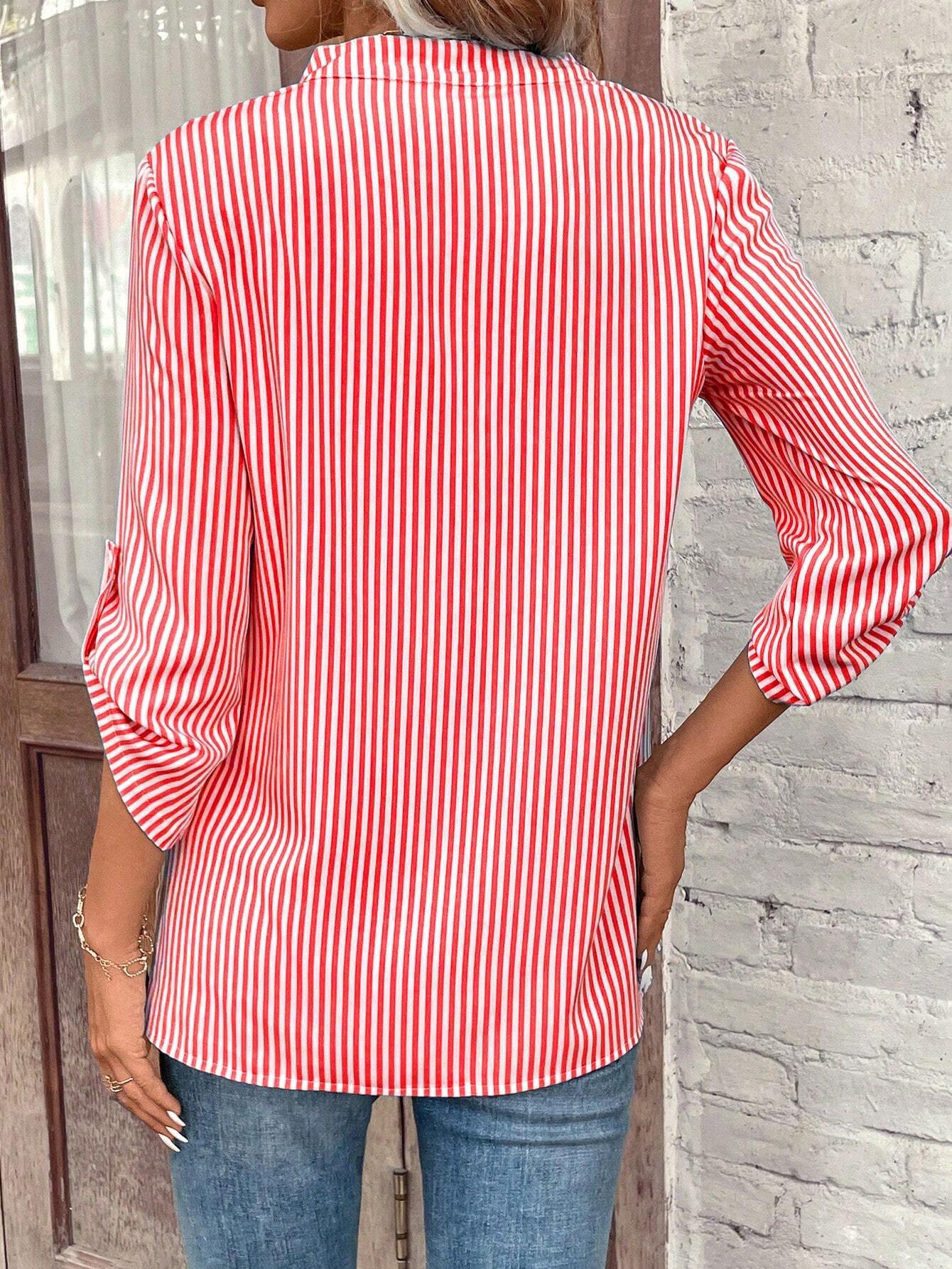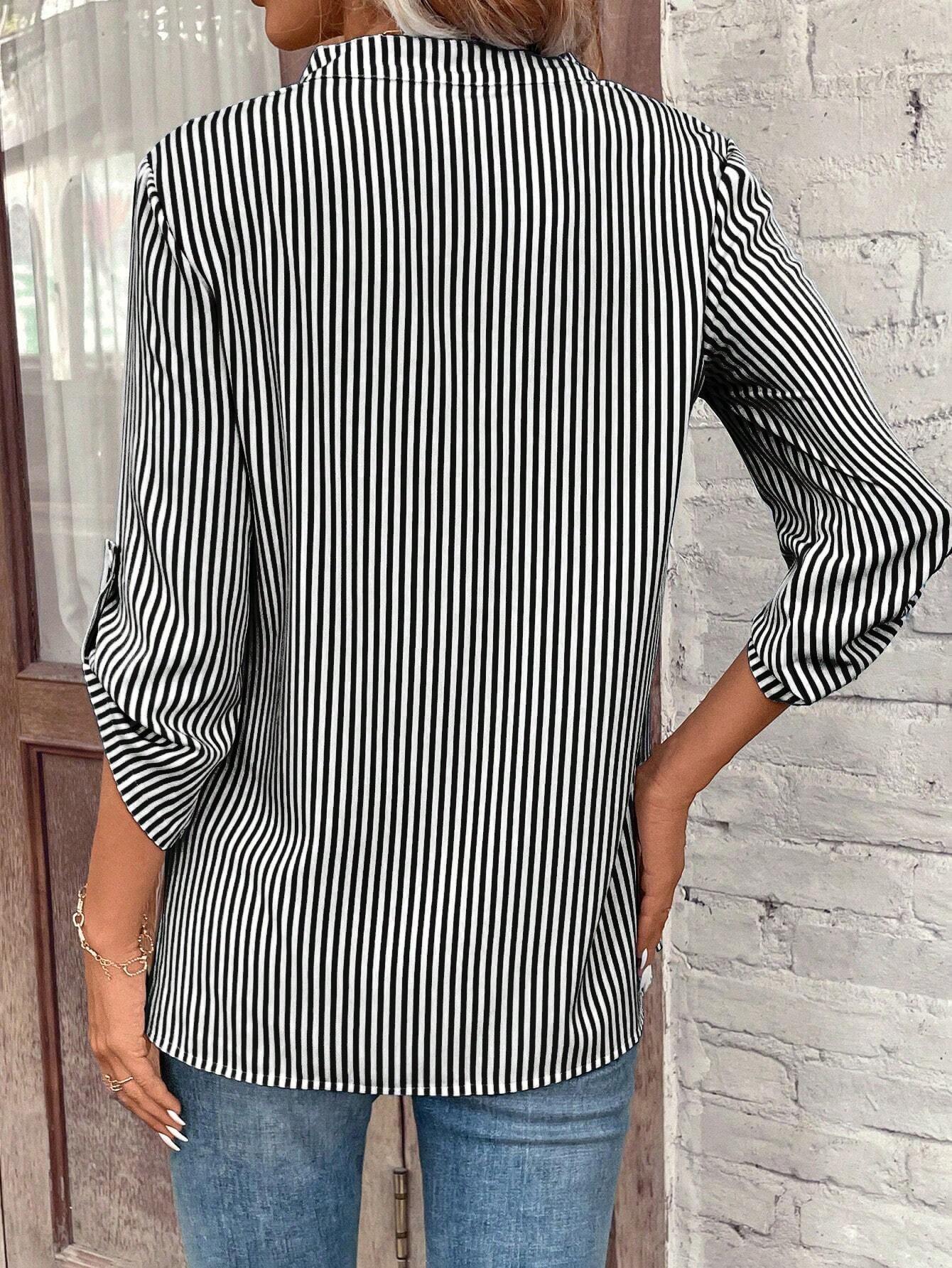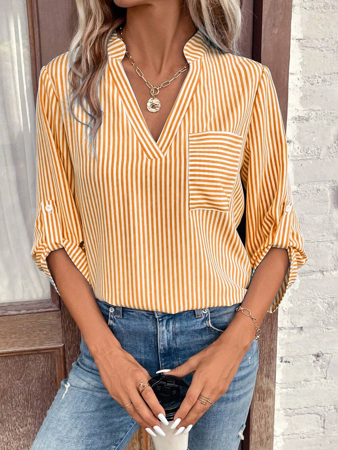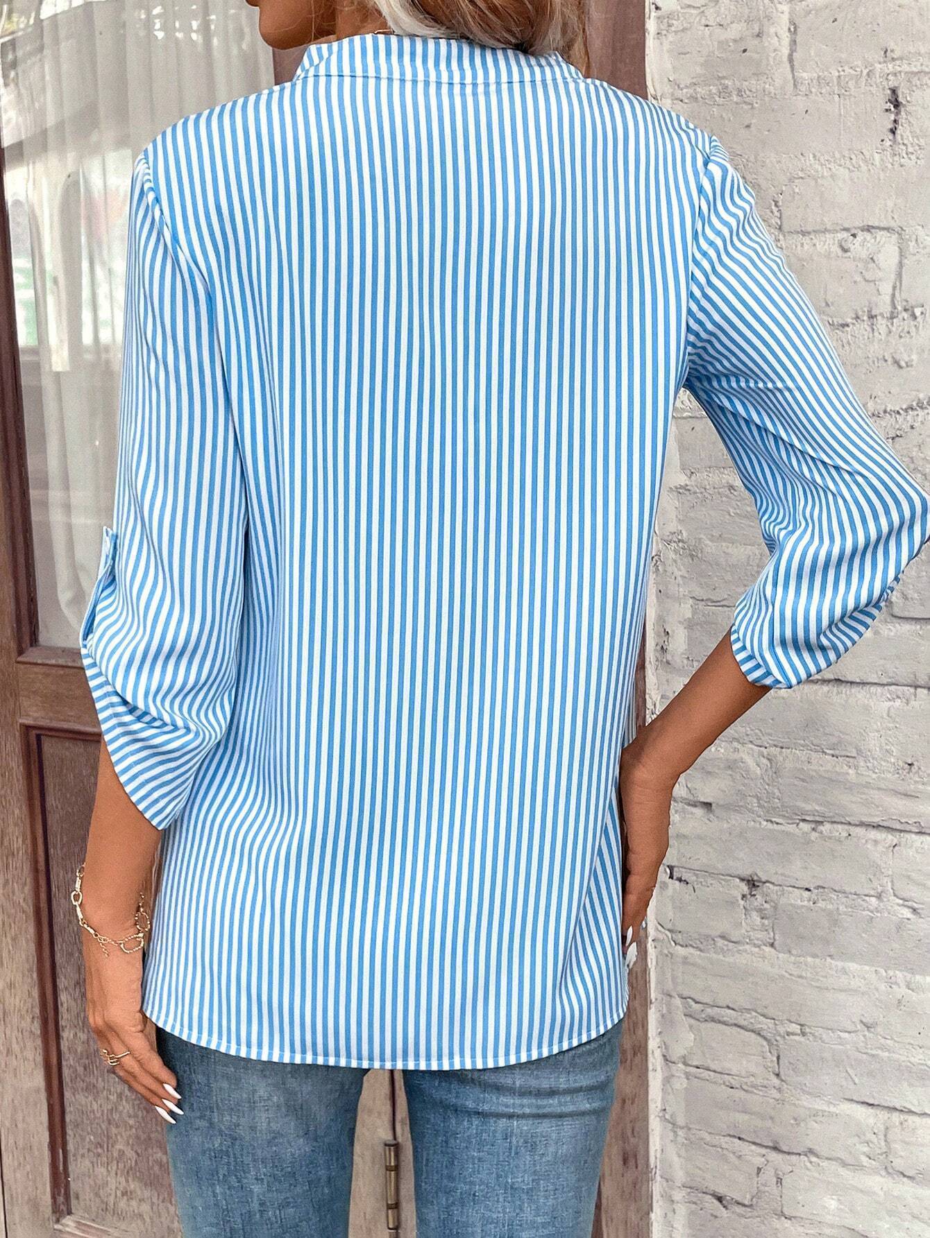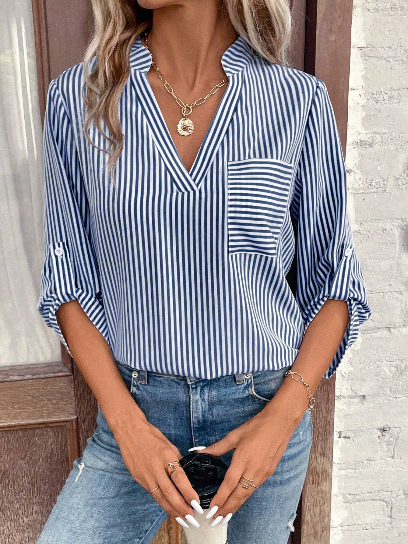 2025年欧米新作アマゾンVネックプルオーバーストライププリントボタン付き長袖カジュアルレディースシャツ