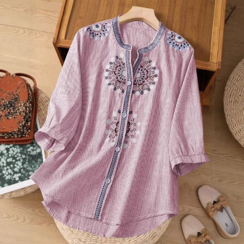 2025欧美跨境新款复古宽松刺绣花立领五分袖衬衫女式衬衣上衣