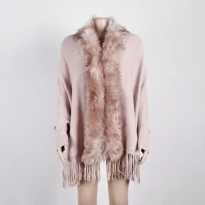 秋冬の欧米風の外国貿易のアマゾンのフリンジマントのマントはキツネの毛の襟のマントの純色のニットのカーディガンをまねます。