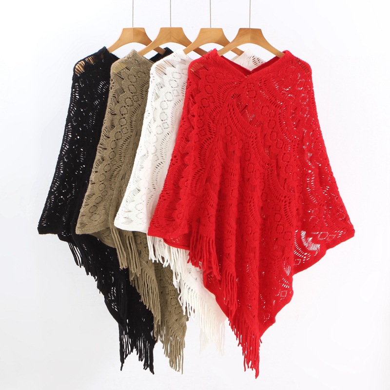 クロスボーダーの中の長いフックの花の透かし彫りのフリンジのプルオーバーのセーターのマントの赤い新婦のマントのニットのコウモリのシャツ