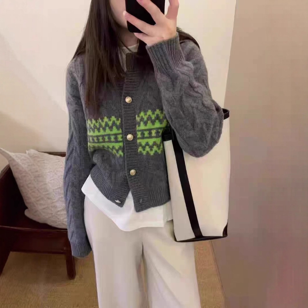 韓国版の灰色の麻花のセーターの女性の春と秋のウールの24新型の柔らかいモチとしたカジュアルな怠惰な風のニットのカーディガンのコート