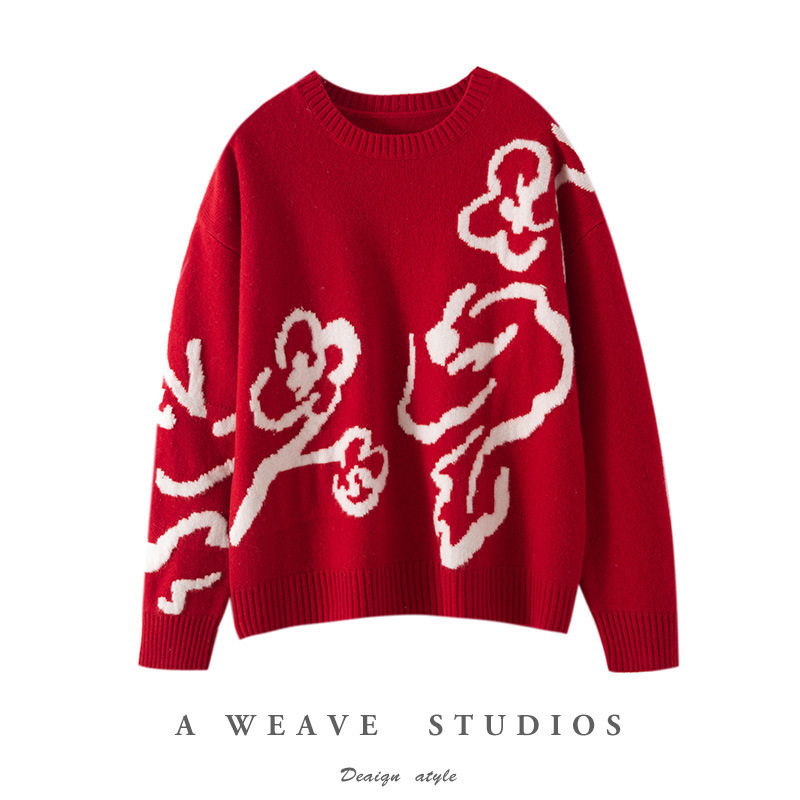 新年糯提花毛衣本命年红色纯羊毛衫女松软针织衫厚慵懒风宽款