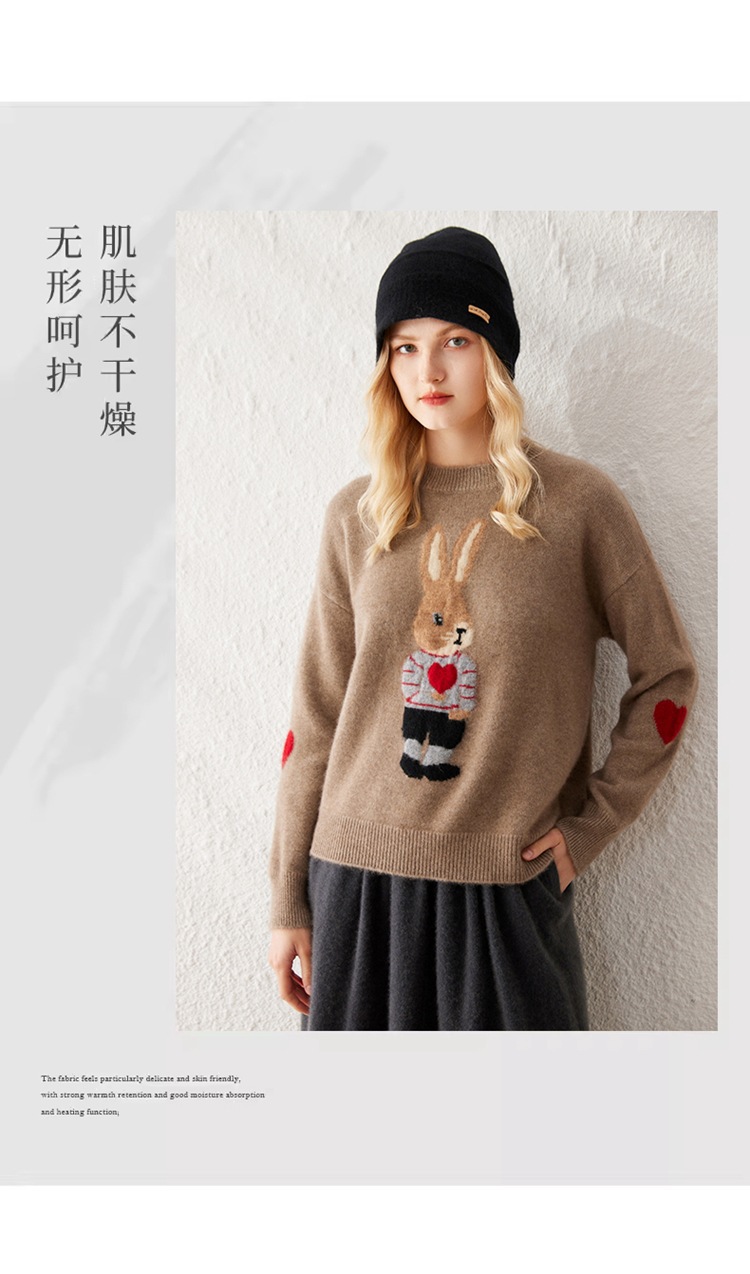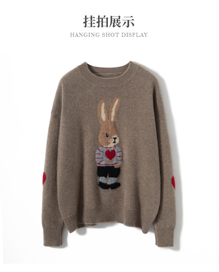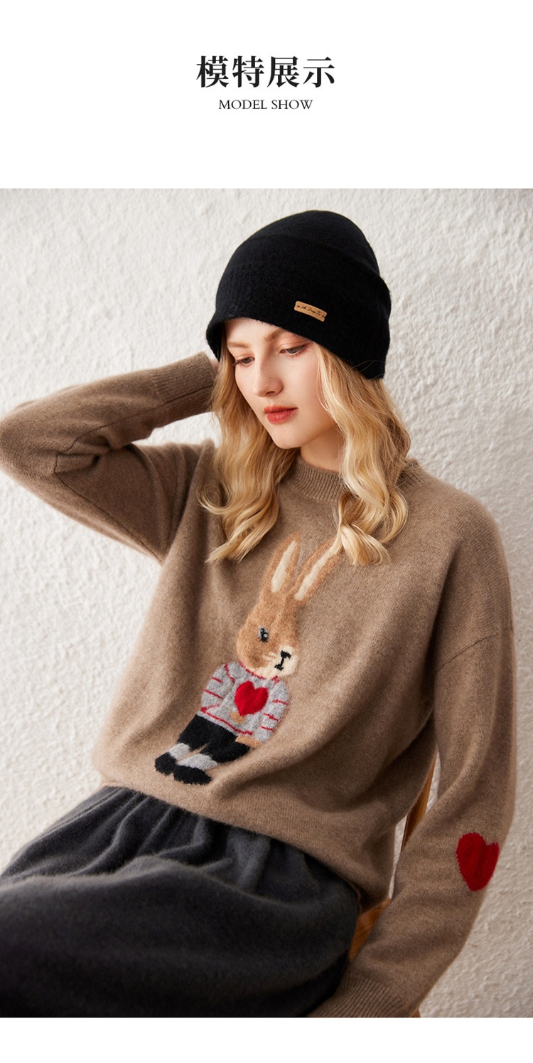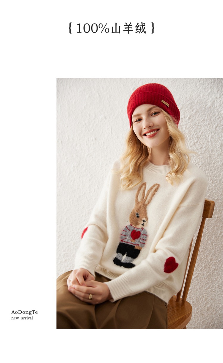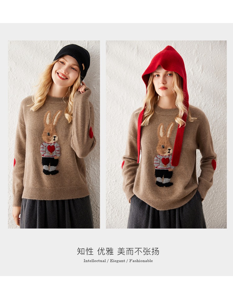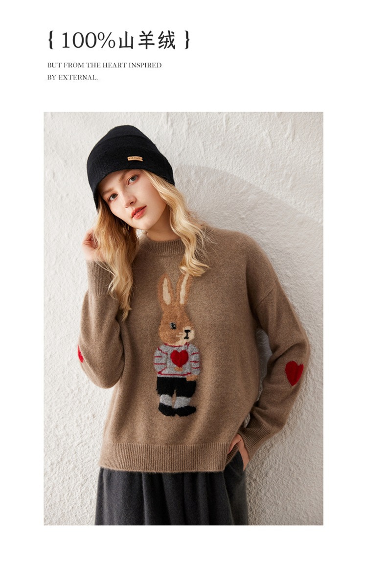 100%山羊绒衫卡通提花兔子羊绒衫女圆领宽松百搭毛衣打底衫秋冬款