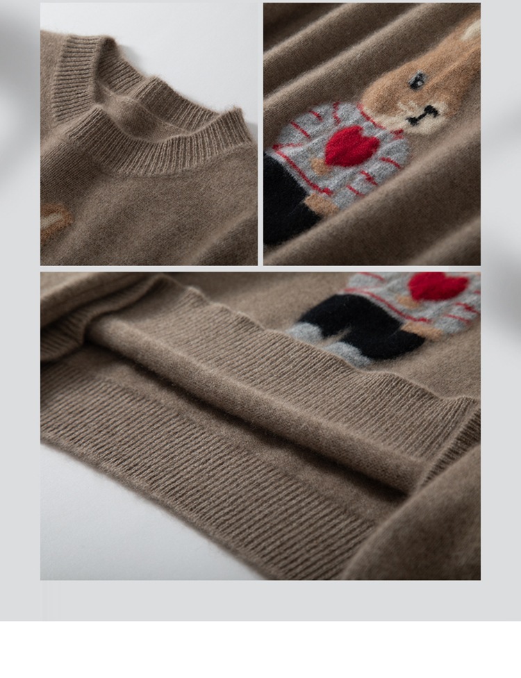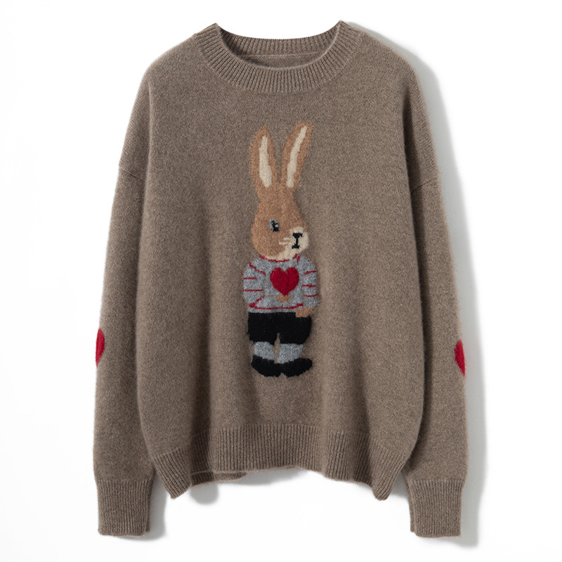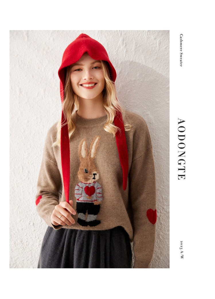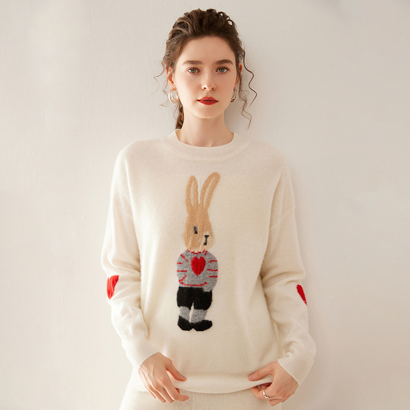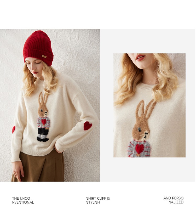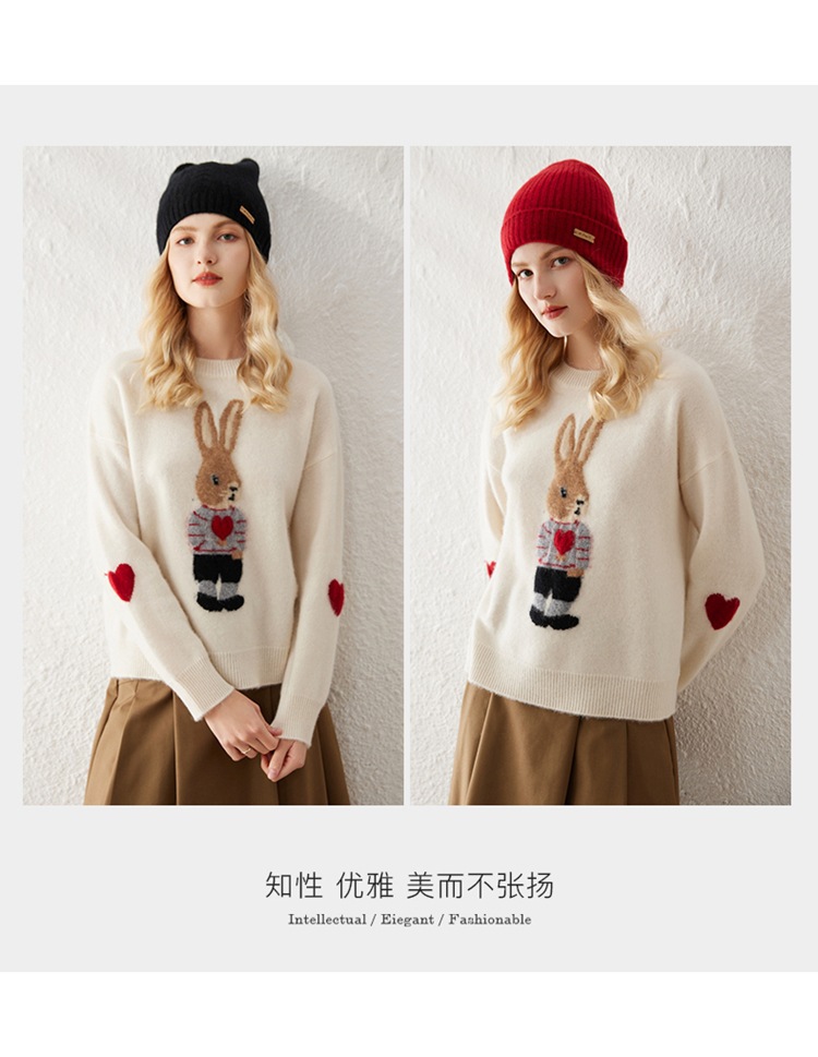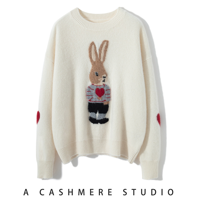100%山羊绒衫卡通提花兔子羊绒衫女圆领宽松百搭毛衣打底衫秋冬款