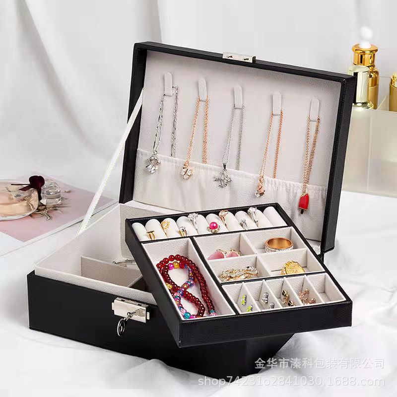 高級皮質二重アクセサリーケースネックレス指輪ジュエリーピアス展示アクセサリー収納ケースロック付き