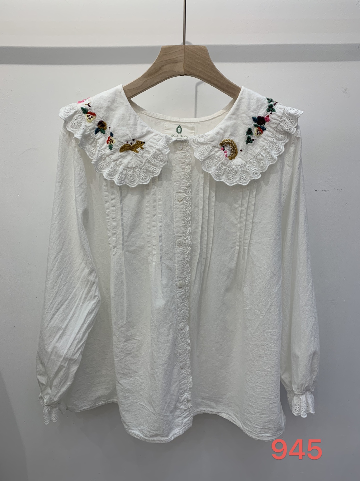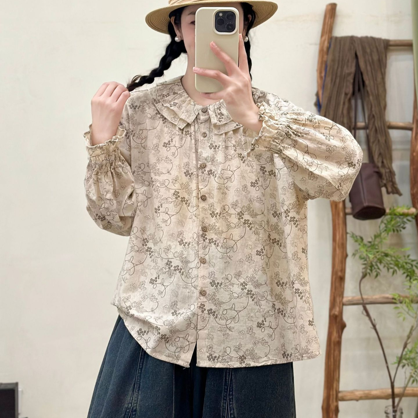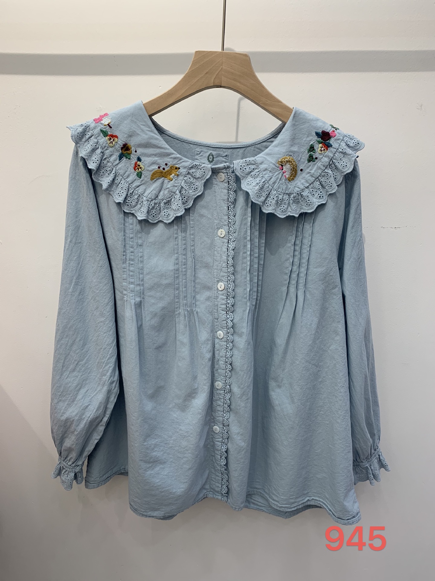 92434森女重工刺繍人形襟綿布ゆるい長袖シャツ折り襟人形シャツ