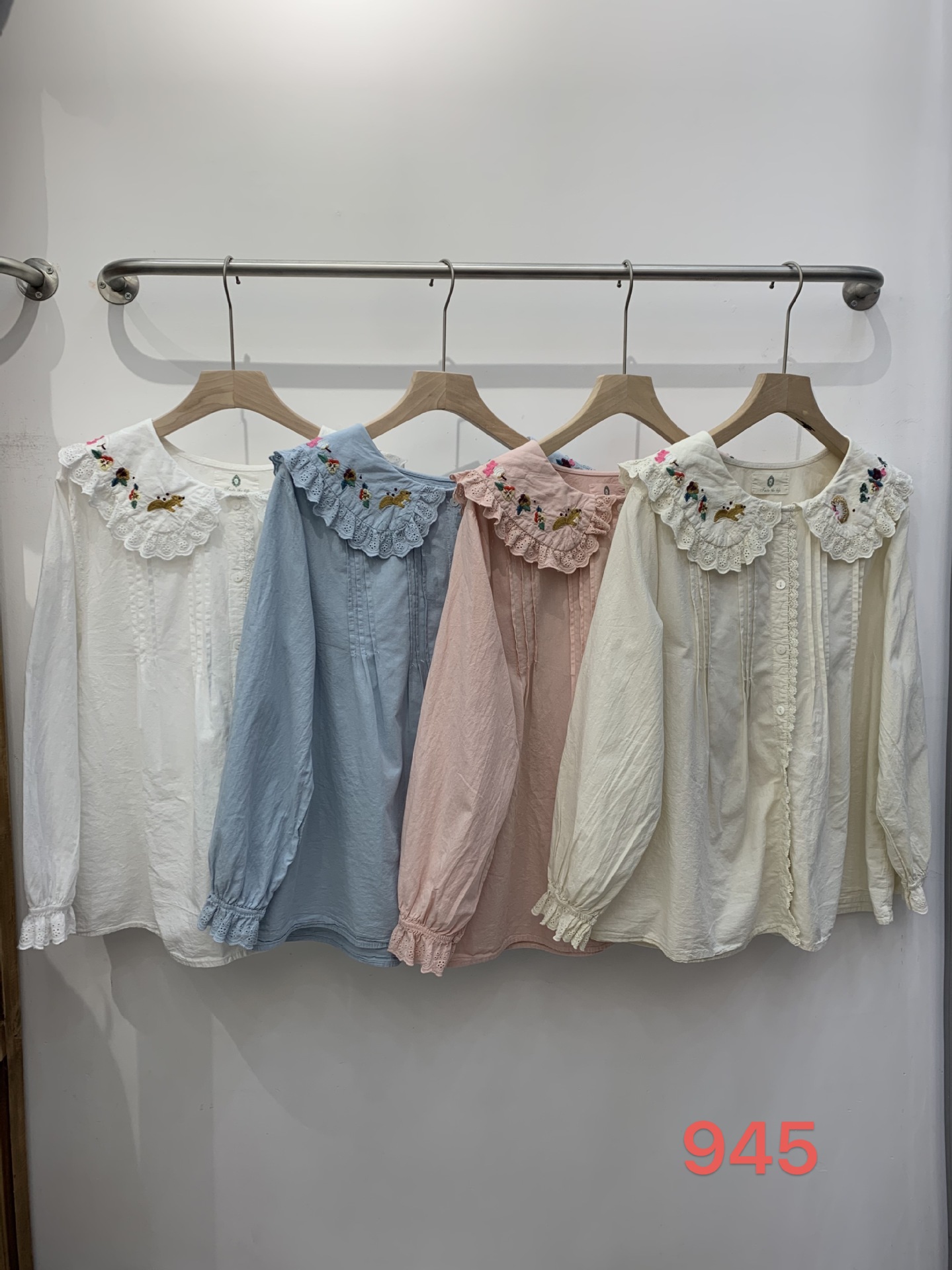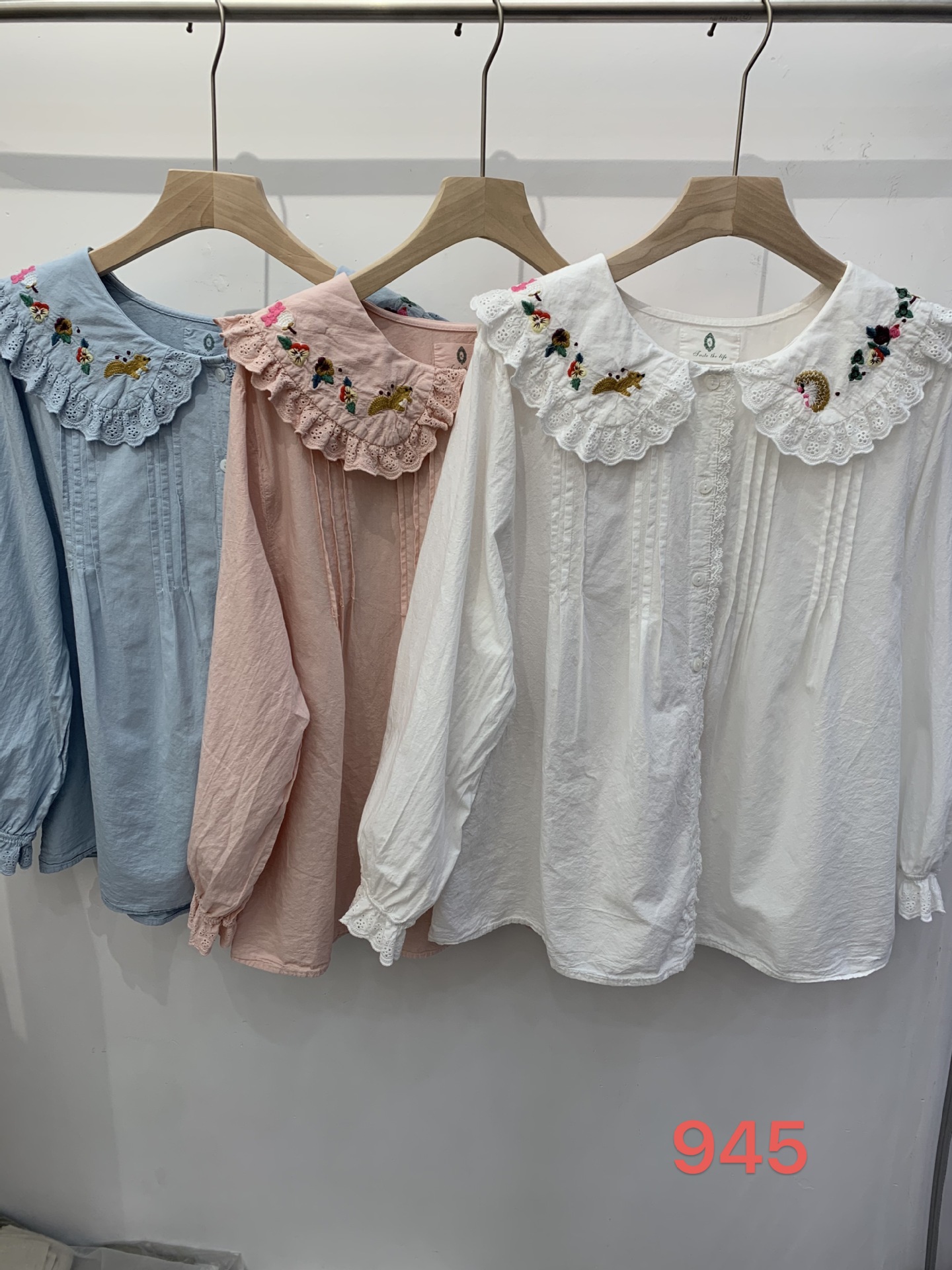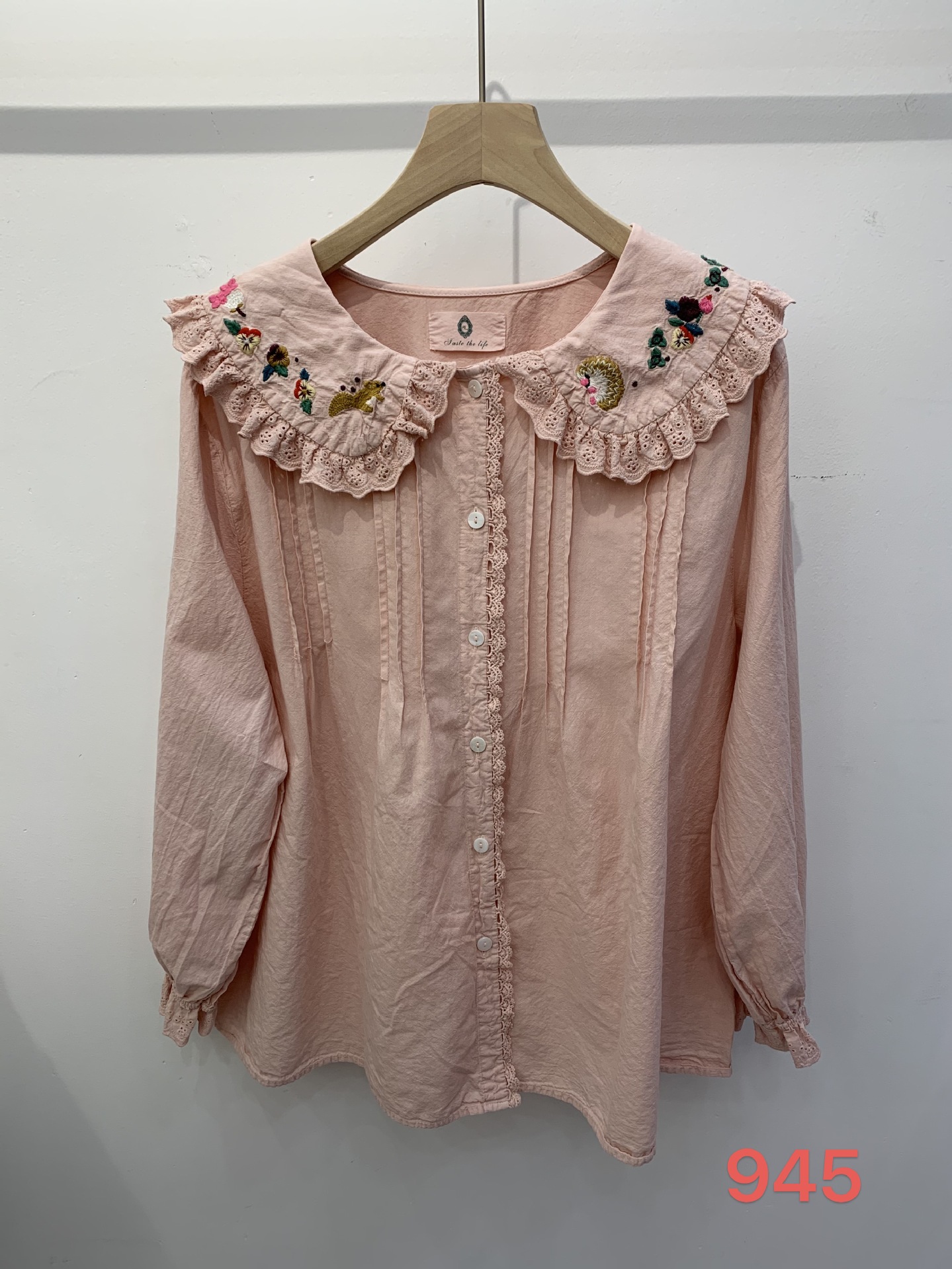 92434森女重工刺繍人形襟綿布ゆるい長袖シャツ折り襟人形シャツ