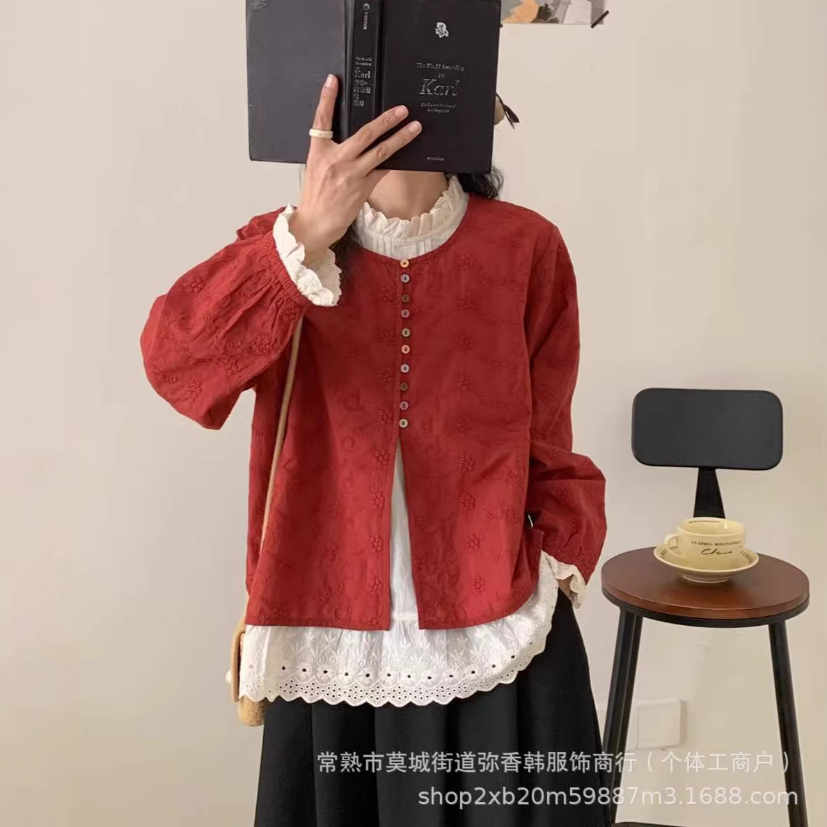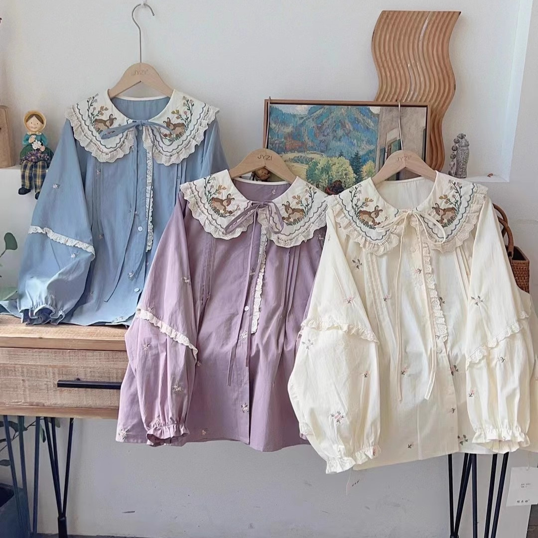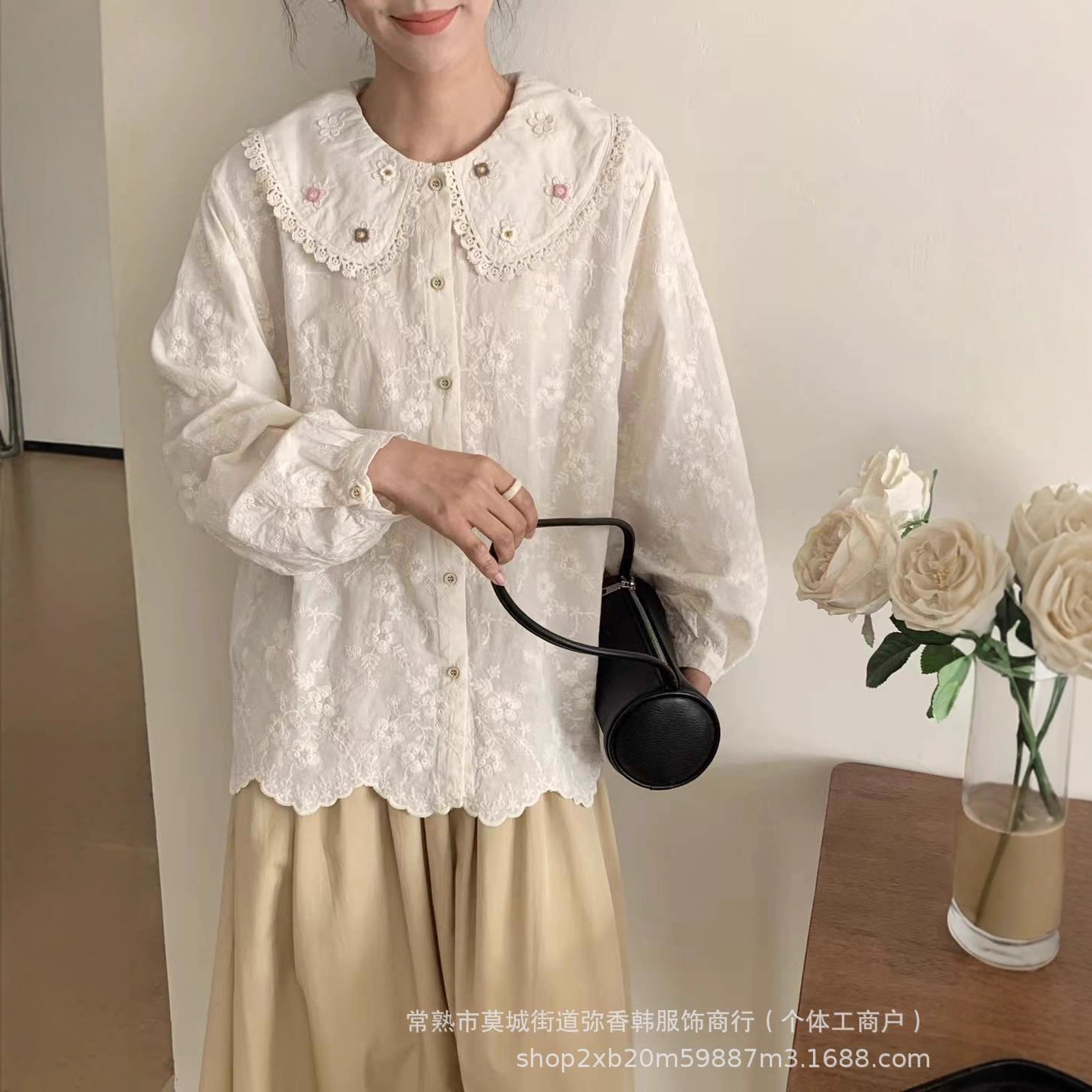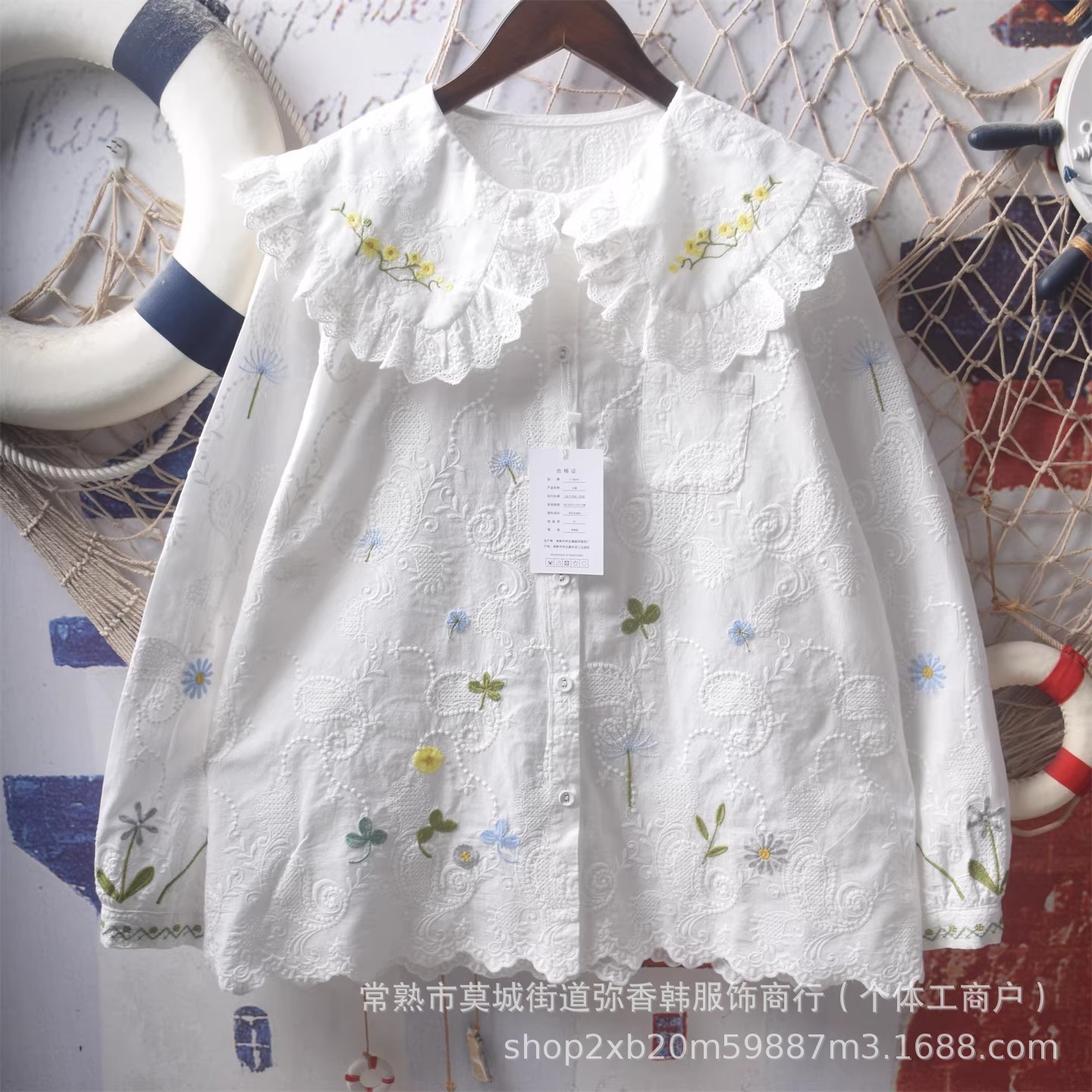 日系女装甘美立体刺繍長袖シャツ女森系ゆるい子供シャツレース文芸上着春