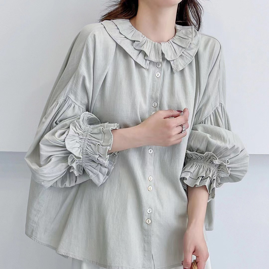 8084フランス式甘美減齢二重児童襟綿麻シャツ女性春の新しいゆるい提灯袖上着