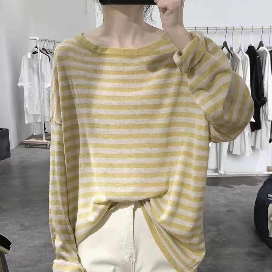 薄いストライプのニットの女性2023秋の新型の通気性のブラウスのシンプルな大きい版のゆったりしている長袖の上着のtシャツ