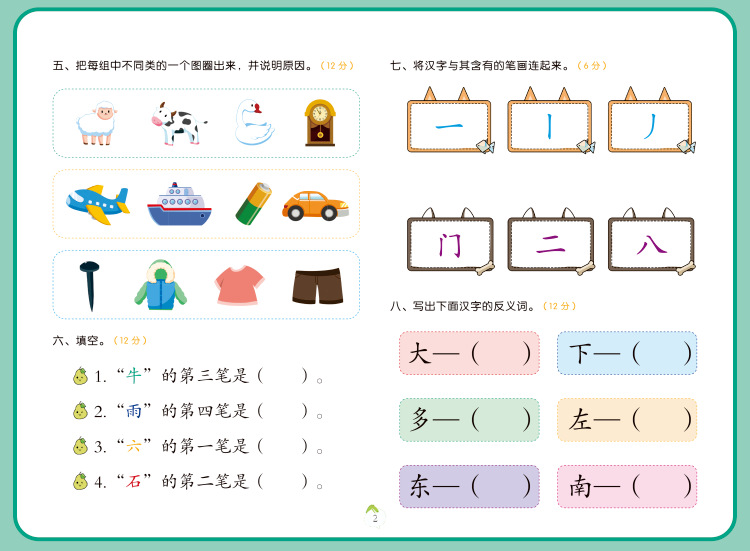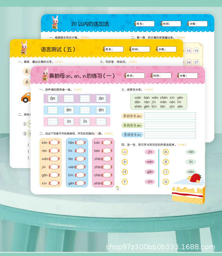 カラー 言語1,言語2,ピンイン1,ピンイン2,数学1【5以内加減算】,数学2【10以内加減算】,数学3【20以内に進入しない場合は退位しない加減算】,数学4【20以内進位退位加減算】,数学5【50以内加減算】,数学6【100以内加減算】