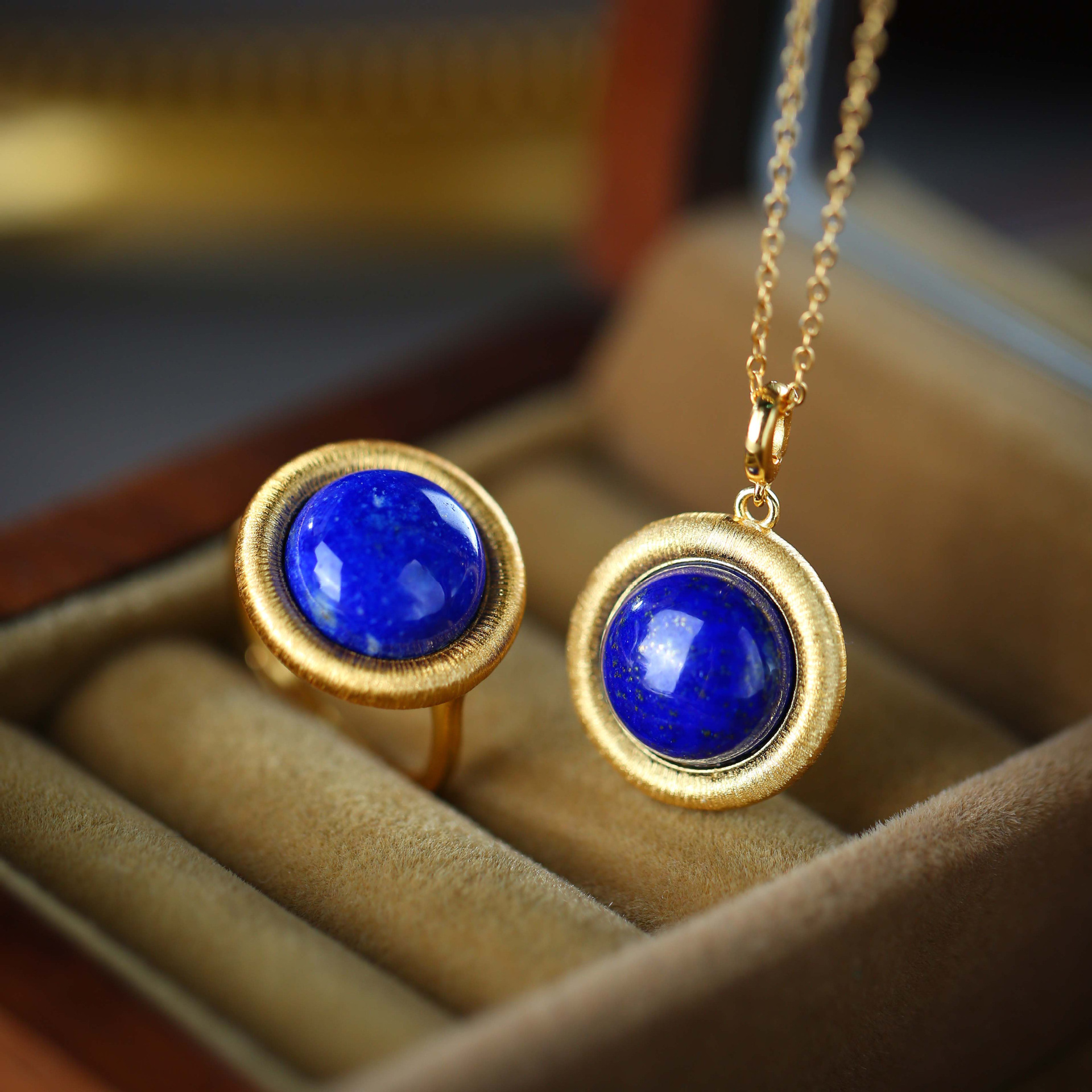 S925純銀金メッキモザイク青金石指輪ペンダントセットレトロ古典的なマット伸線円形シンプル