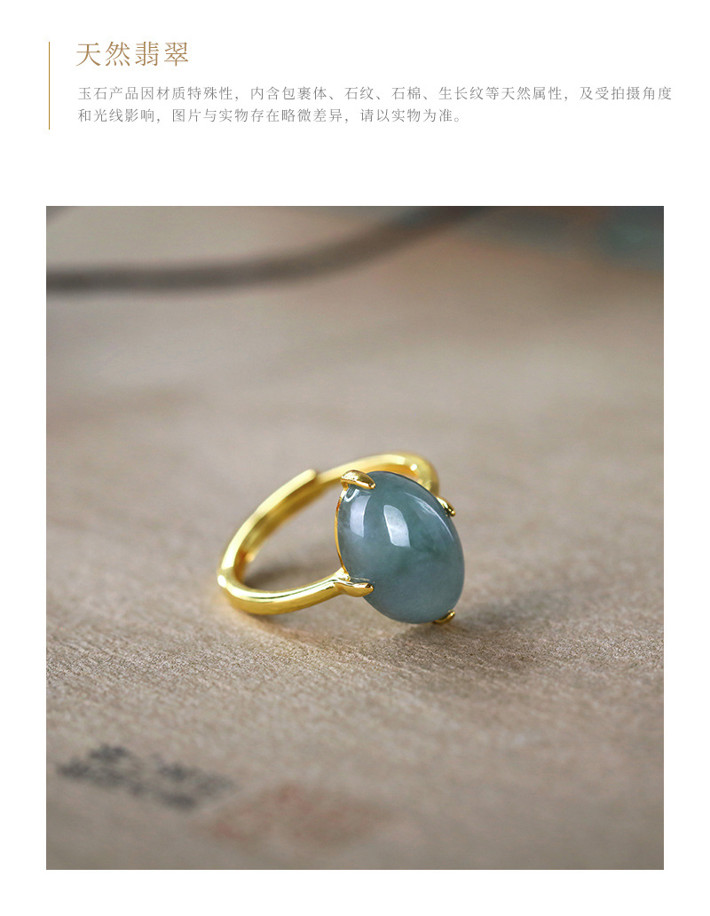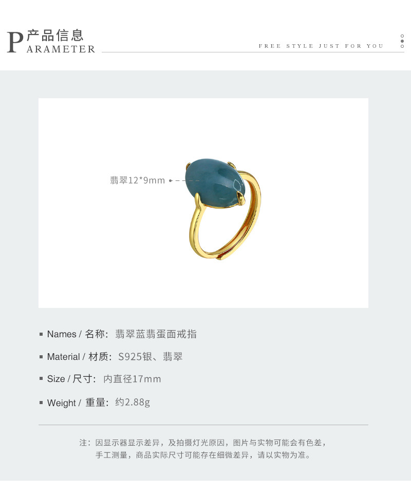 S925純銀金メッキは天然a品の青い水の翡翠の指輪をはめ込んでいます。