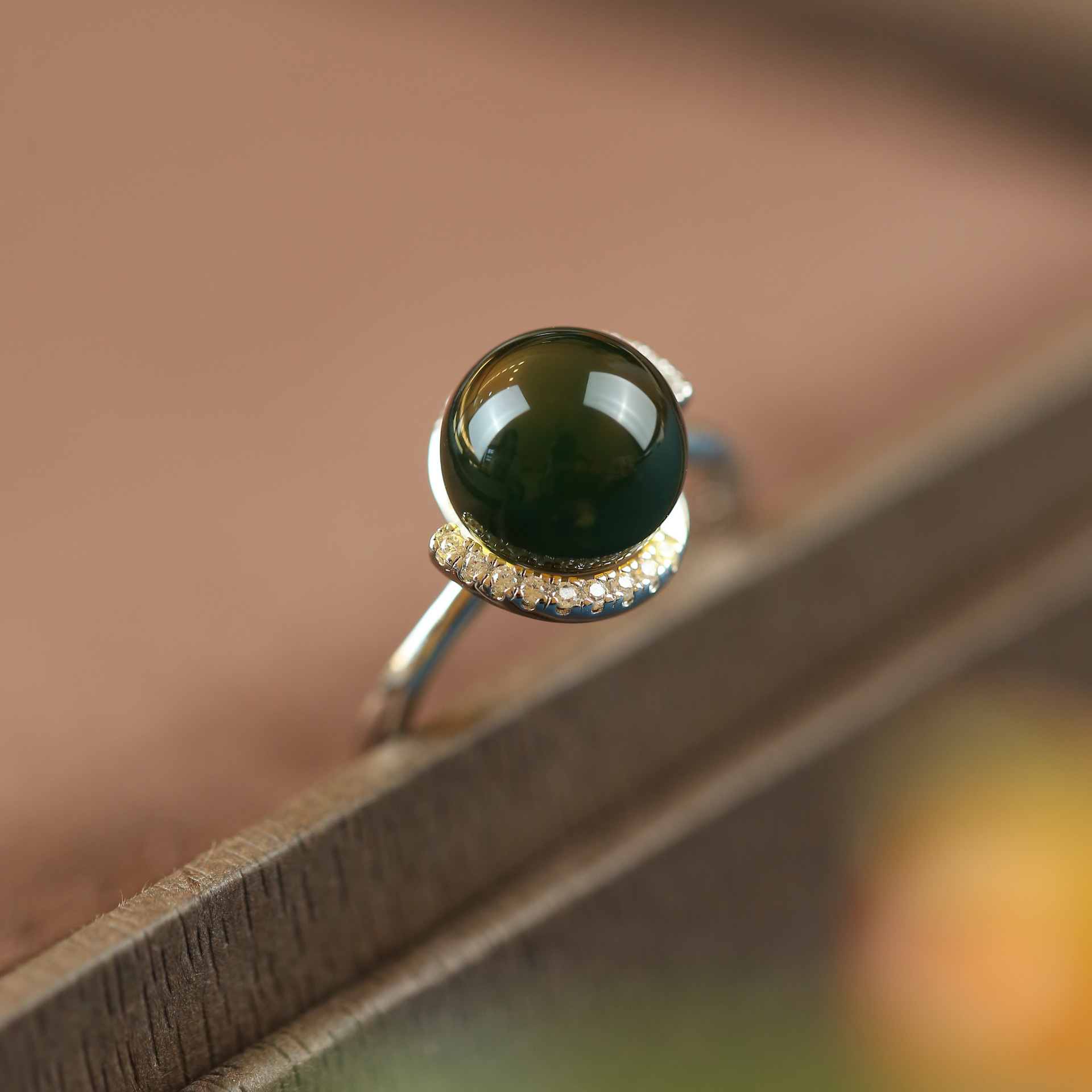 S925银天然非洲翠镶嵌锆石戒指简约时尚通勤百搭精致气质高级感、