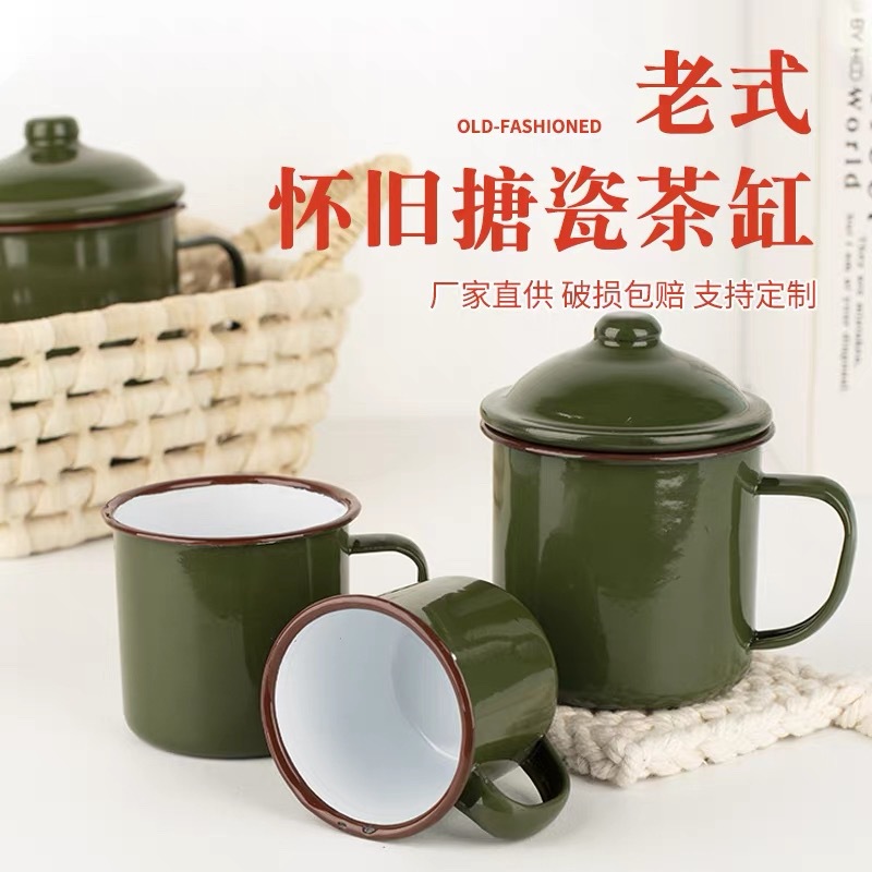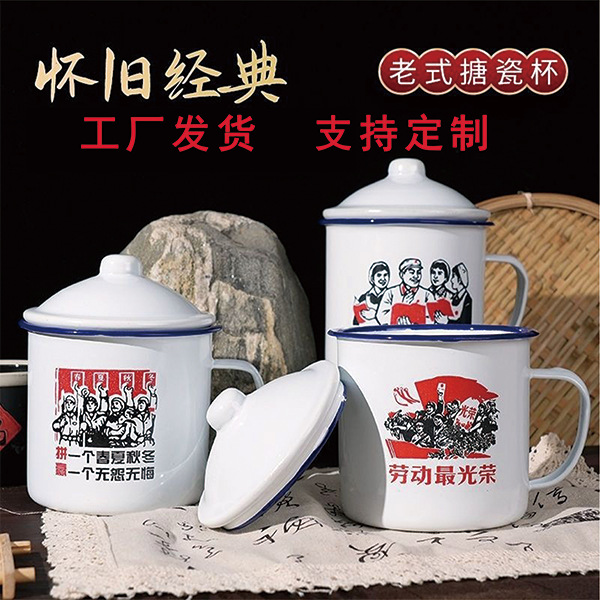 古风复古搪瓷杯带盖大容量冰霸杯马克杯印制LOGO文字图案搪瓷茶缸