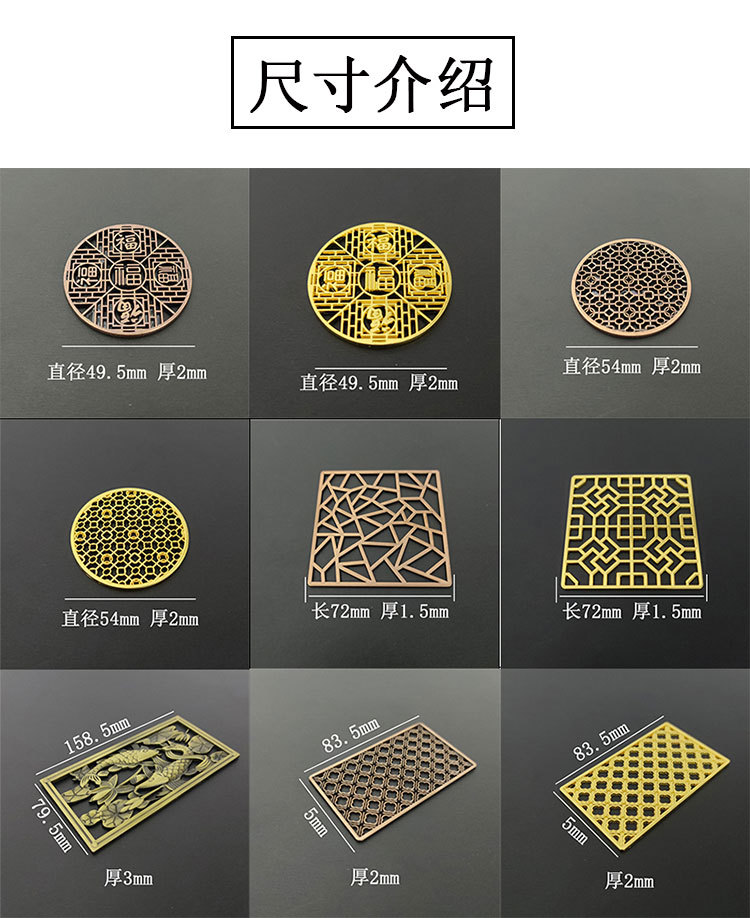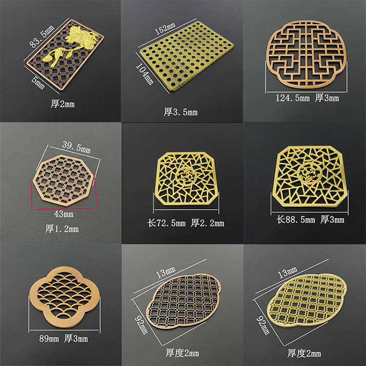 カラー 01種類の紅銅色の五福直径49.5mm,02種類の明るい金色の五福直径49.5mm,03種類の赤銅色のハニカム状の直径54mm,04種類の明るい金のハニカム状の直径54mm,05 ブロンズハニカムフィルター直径 100MM,06 ブロンズメッシュフィルター直径 100MM,07種類の赤銅色方形72x72mm,08項の明るい金の四角形の72x72mm,09種類の青銅色の魚93x93mm,10種類の青銅魚158.5x79.5mm,11種類の四つ葉のクローバー 赤銅色 83.5x50mm,12種類の四つ葉草の明るい金色83x50mm,13種類の紅銅色のハスの花83x50mm,14種類の青銅色角形丸穴104x152mm,15種類の青銅色フィルタ246x80mm,16種類の青銅色フィルタ290x73mm,17種類の赤銅色124.5mm,18種類の赤銅色八角形,19種類の明るい金八角72.5mm,20種類の明るい金八角88.5mm,21種類の祥雲紅銅色89mm,22種類の赤銅色のハニカム状13092mm,23種類の明るい金色のハニカム状13092mm,24種類の紅銅色の五福直径129mm,25種類の魚芝居ハスの花の直径60mm,26種類の赤銅色六角形フィルタ