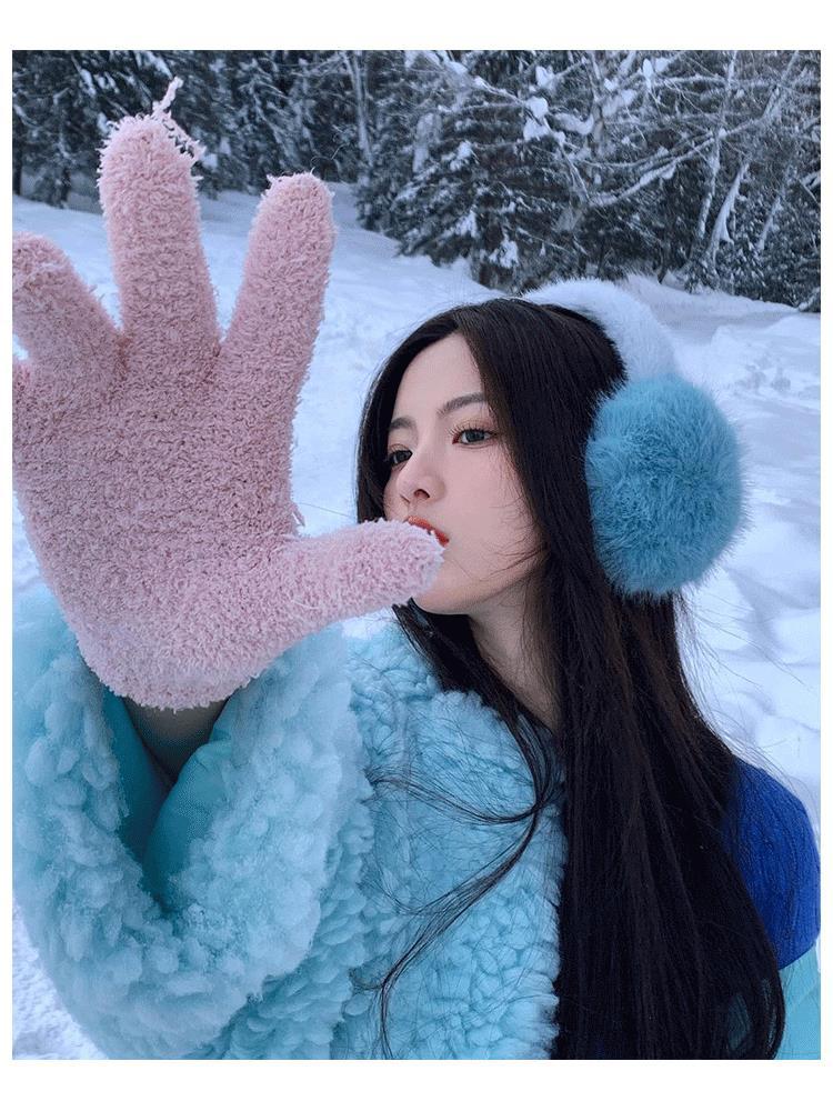 冬の少女のぬいぐるみの耳カバーの女子学生は青い大サイズの耳に乗って冬の耳を温めて防風耳カバーを厚くします。