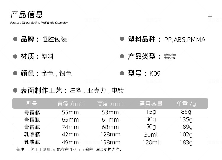 現物は新商品のアクリル二重メッキクリーム瓶を販売しています。