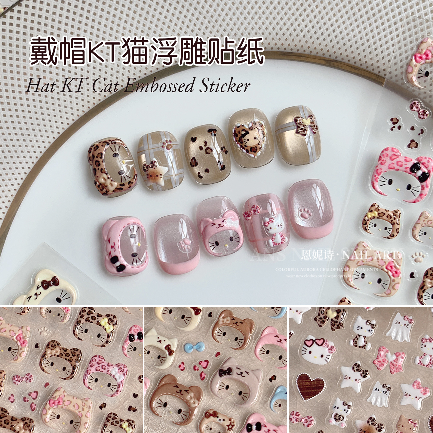 网红爆款戴帽KT猫浮雕美甲贴纸秋冬豹纹卡通头套猫咪指甲贴装饰品