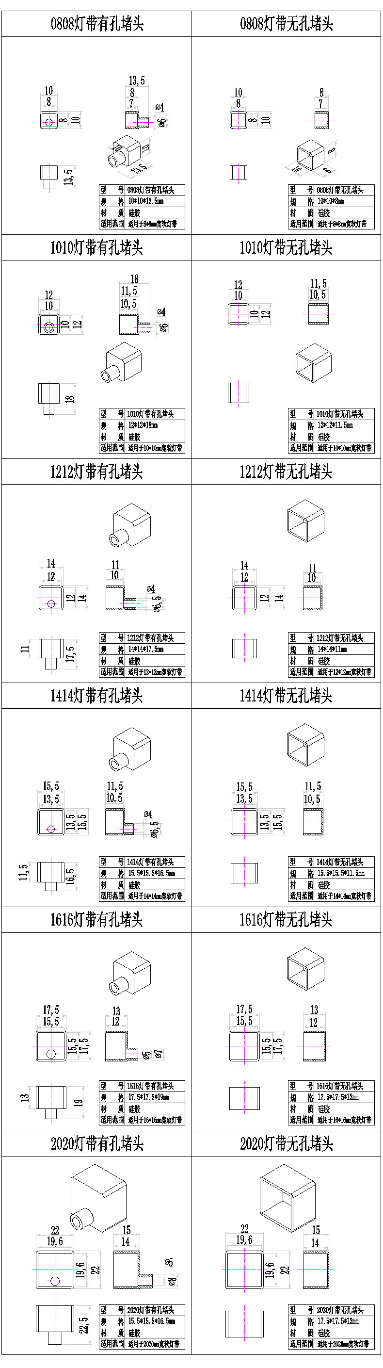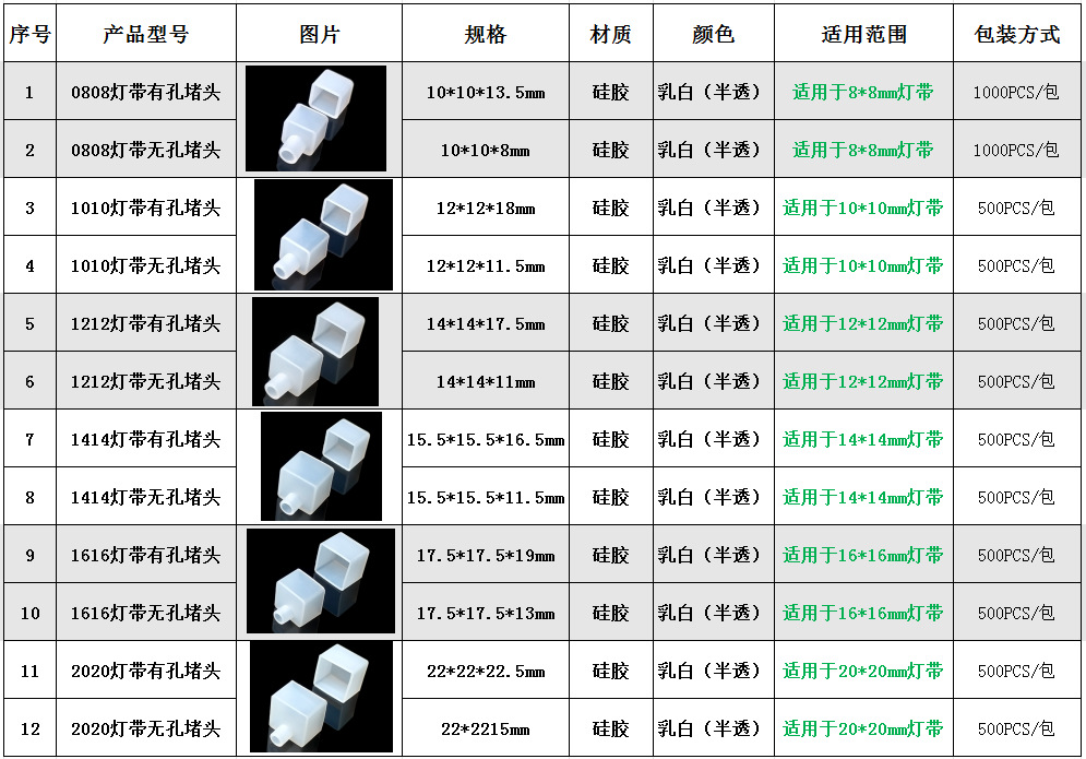 商品番号 0808/1010/1212/1414/1616/2020 シリコンライトストリッププラグ