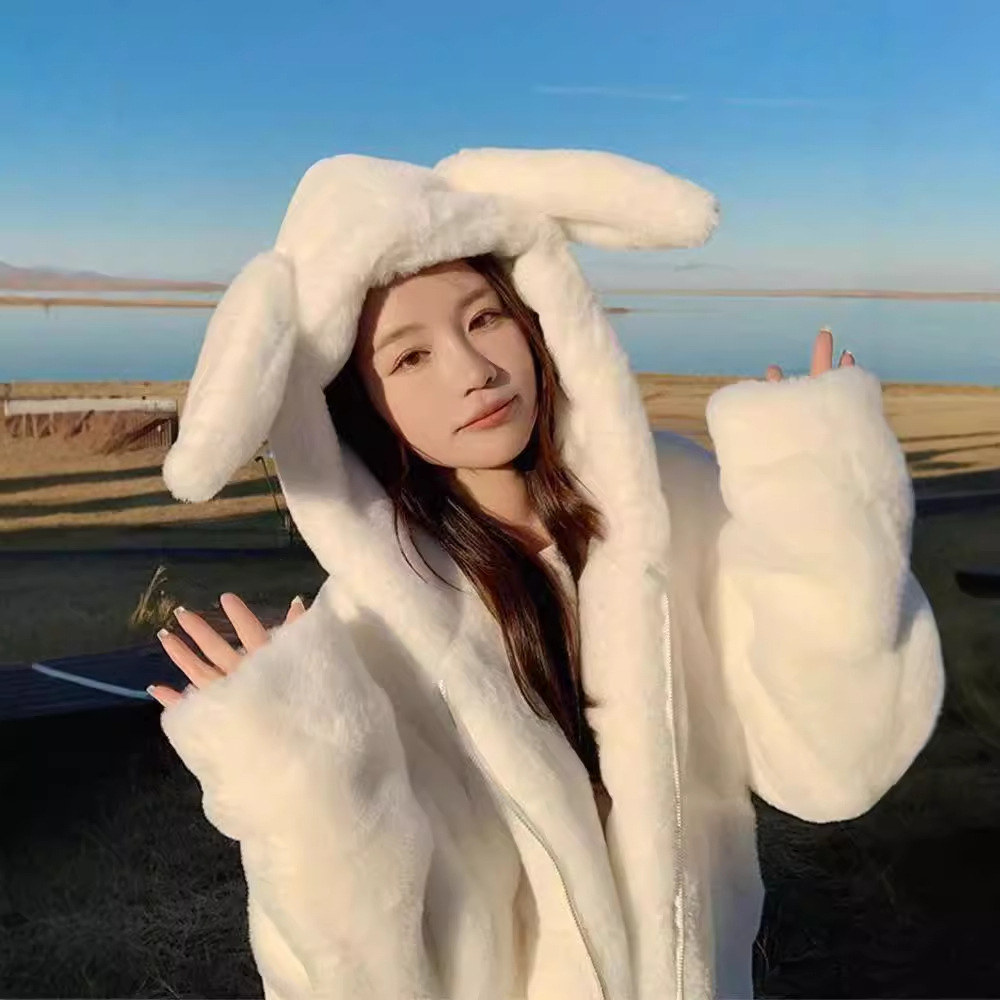 特厚奶兔耳朵可爱羊羔毛外套女冬2025新款含棉加厚软糯毛茸茸棉服