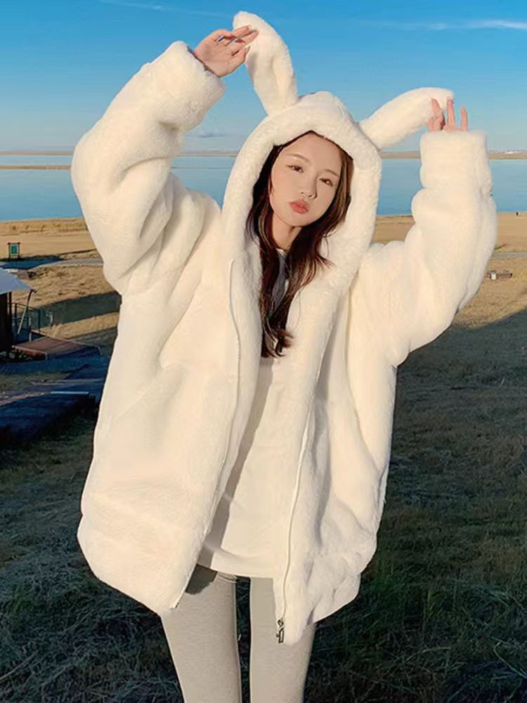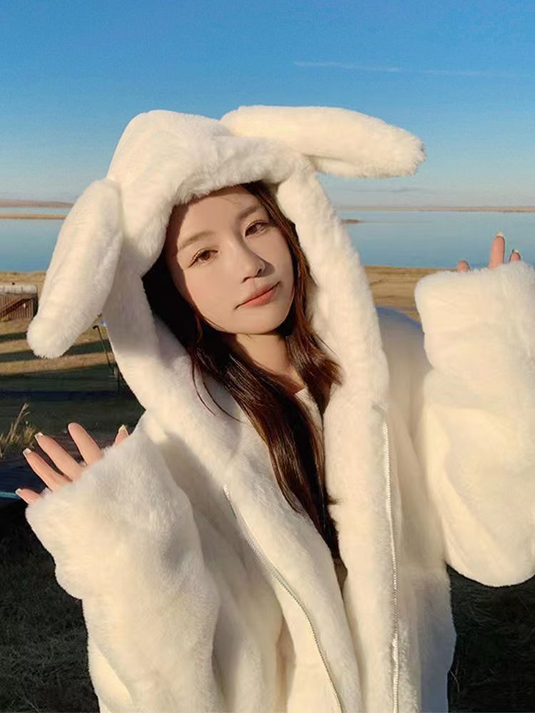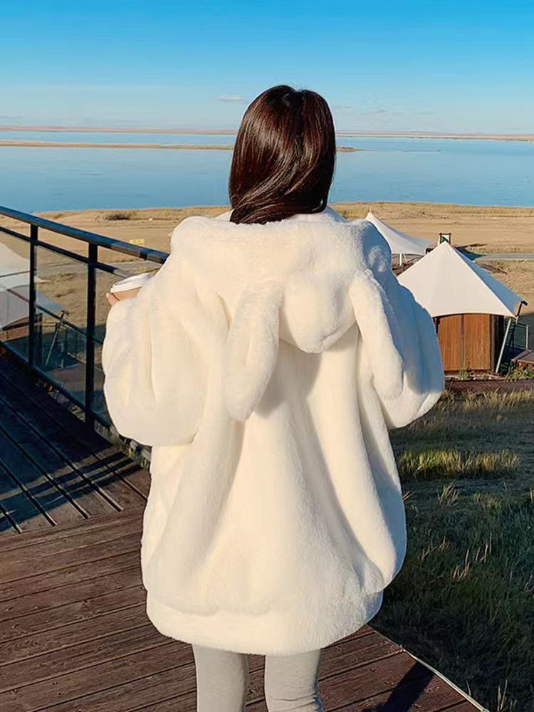 かわいいウサギの耳付きフェイクファーふわふわコート レディース 中綿入り 2025秋冬 ミドル丈 厚手ラムウールコート
