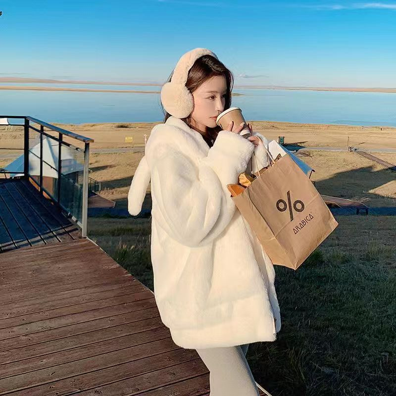 2024韩版宽松毛绒绒外套女冬仿獭兔羊羔绒中长款加厚连帽外衣