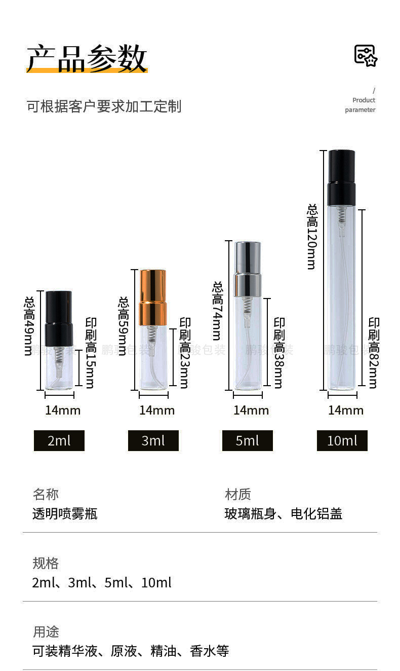 仕様とモデル 2ml (14*30);ゴールドスプレーヘッド付き;ガラス,2ml (14*30);シルバースプレーヘッド付き;ガラス,2ml (14*30);黒いスプレーヘッド付き;ガラス,3ml (14*40);ゴールドスプレーヘッド付き;ガラス,3ml (14*40); シルバースプレーヘッド付き; ガラス,3ml (14*40);黒いスプレーヘッド付き;ガラス,5ml (14*55); ゴールドスプレーヘッド付き; ガラス,5ml (14*55); シルバースプレーヘッド付き; ガラス,5ml (14*55); 黒いスプレーヘッド付き; ガラス,10ml (14*100);ゴールドスプレーヘッド付き;ガラス,10ml (14*100);シルバースプレーヘッド付き;ガラス,10ml (14*100);黒いスプレーヘッド付き;ガラス