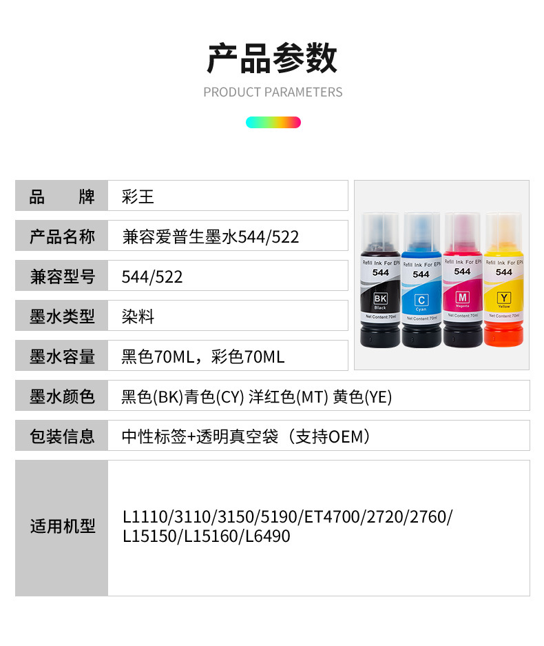 エプソン544インクカラーインクジェット染料3150南米北米522プリンターブルーイエローに適用