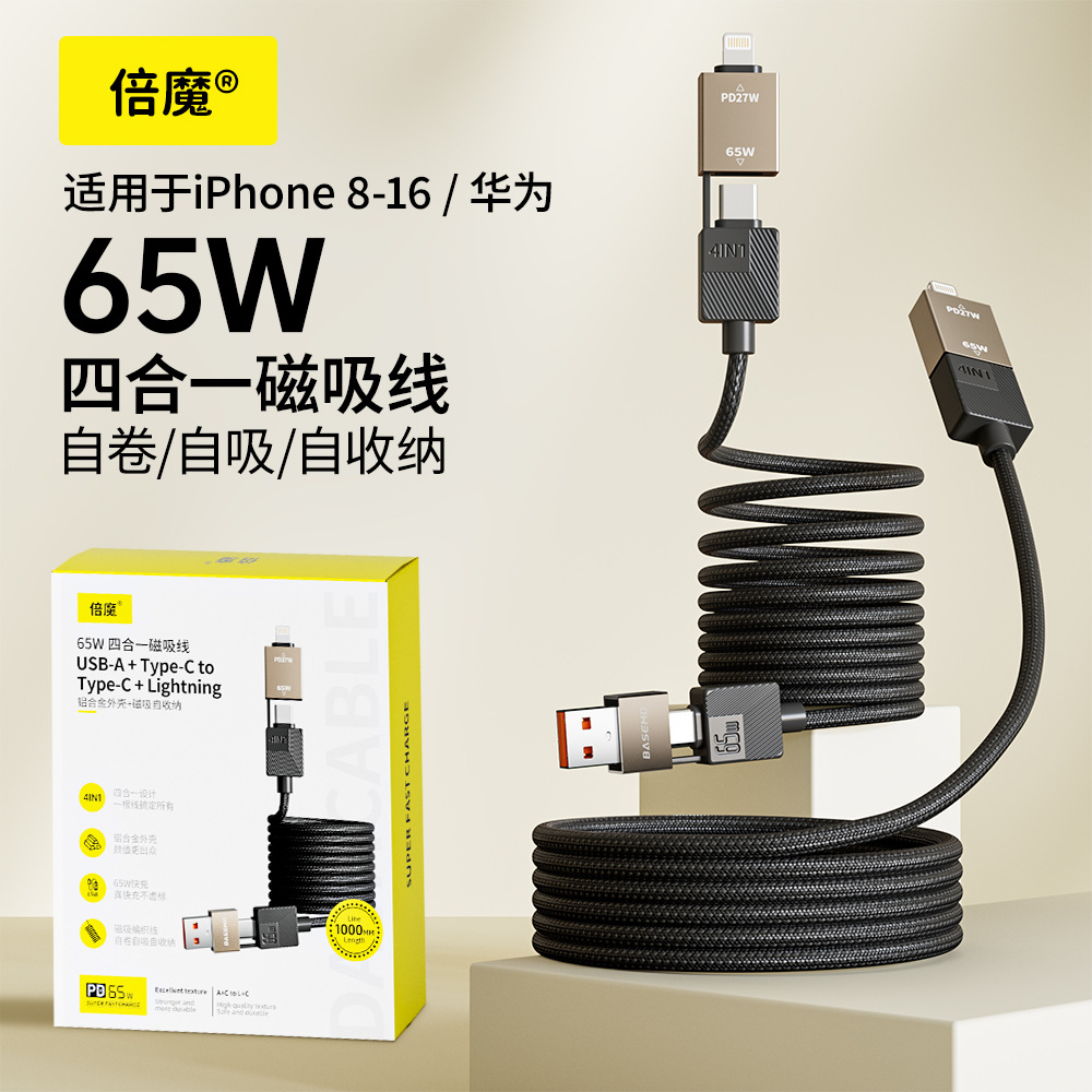 【超急速充電】倍魔4-in-1磁気吸着65W、Huawei PD急速充電対応、Apple 16対応編み込み急速充電ケーブル。
