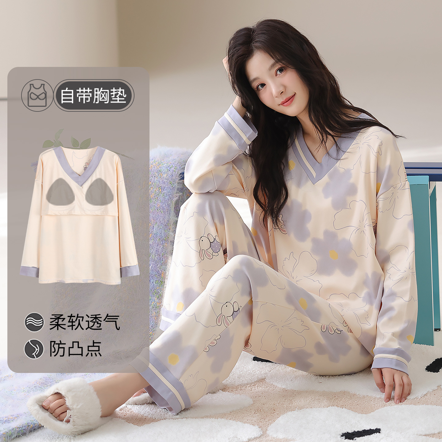 带胸垫睡衣女春秋纯棉长袖2026新款休闲外穿套头家居服秋冬季薄款
