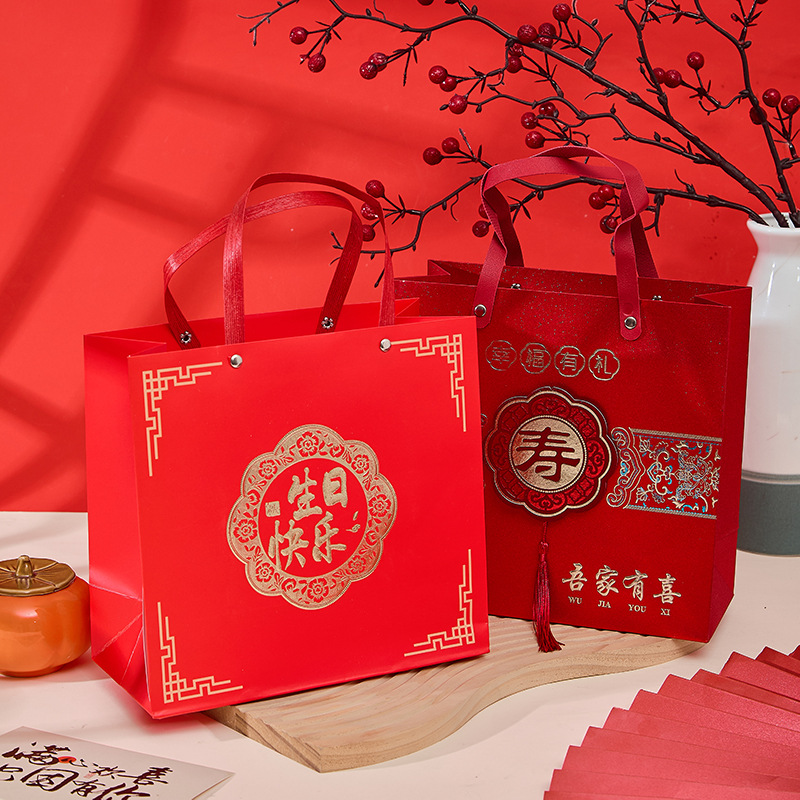 中国風ギフトバッグお祝い赤い紙袋結婚お返しギフトバッグ誕生日手提げ袋赤ちゃん満月百日ギフトバッグ