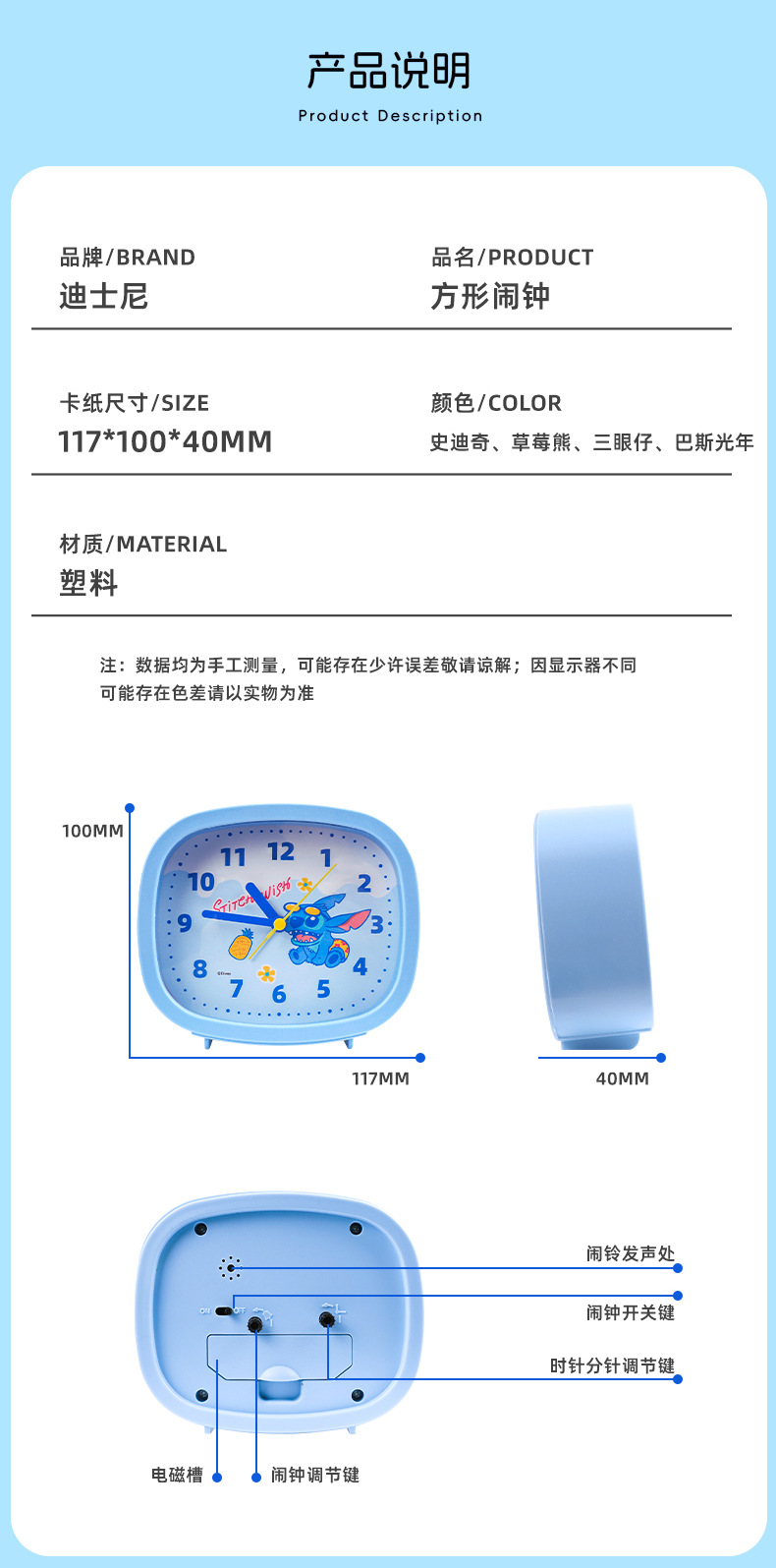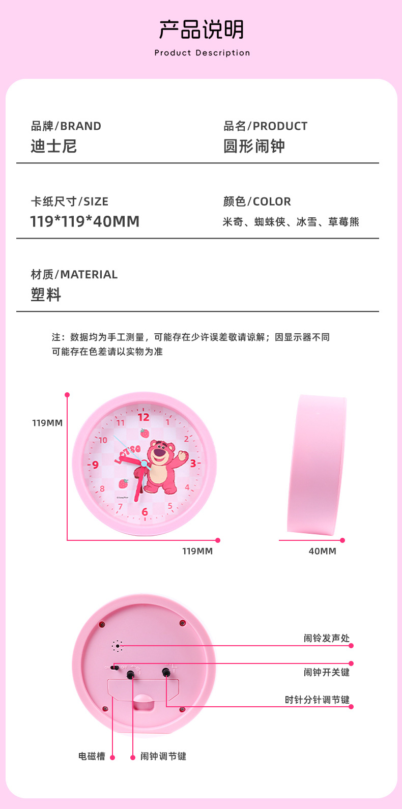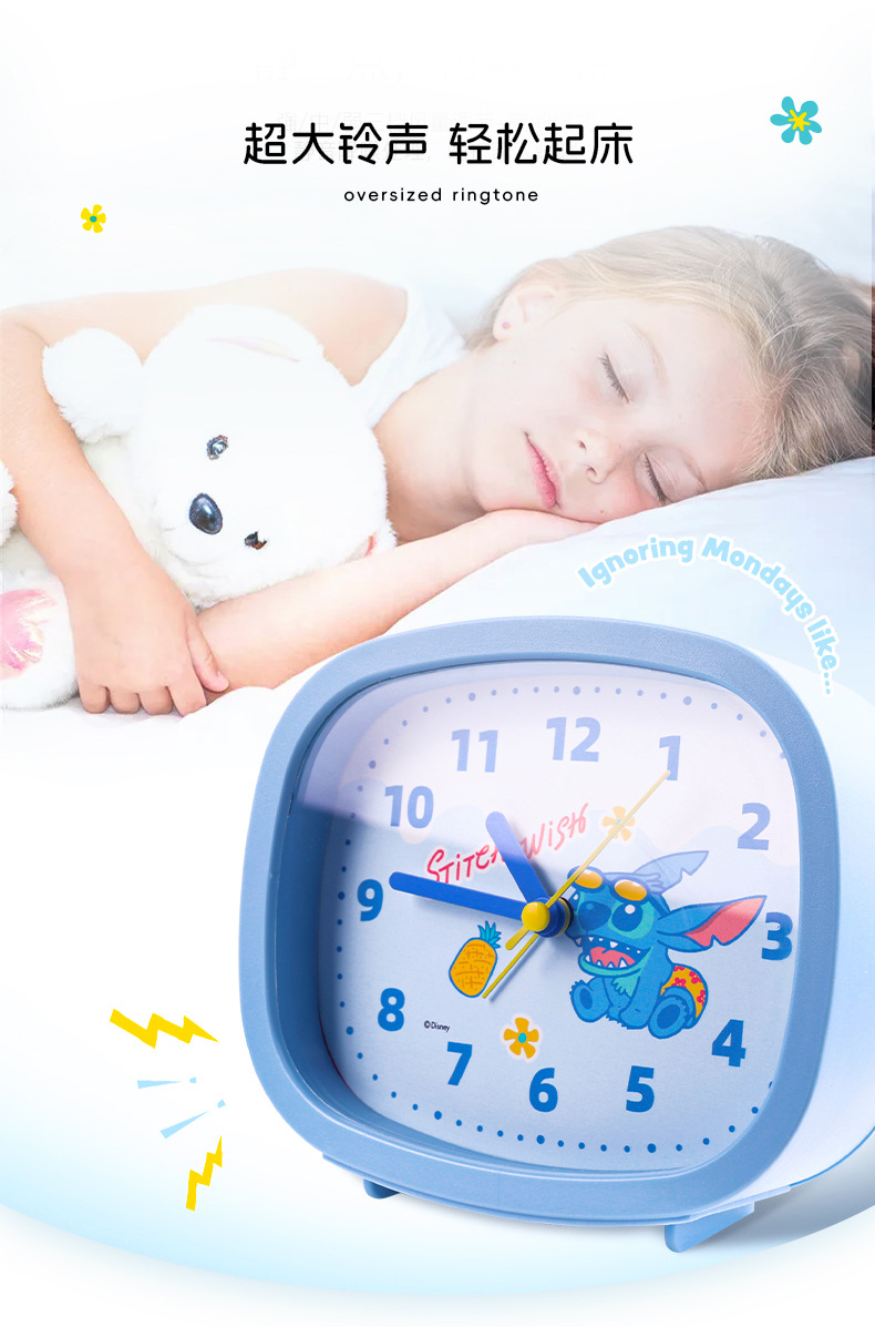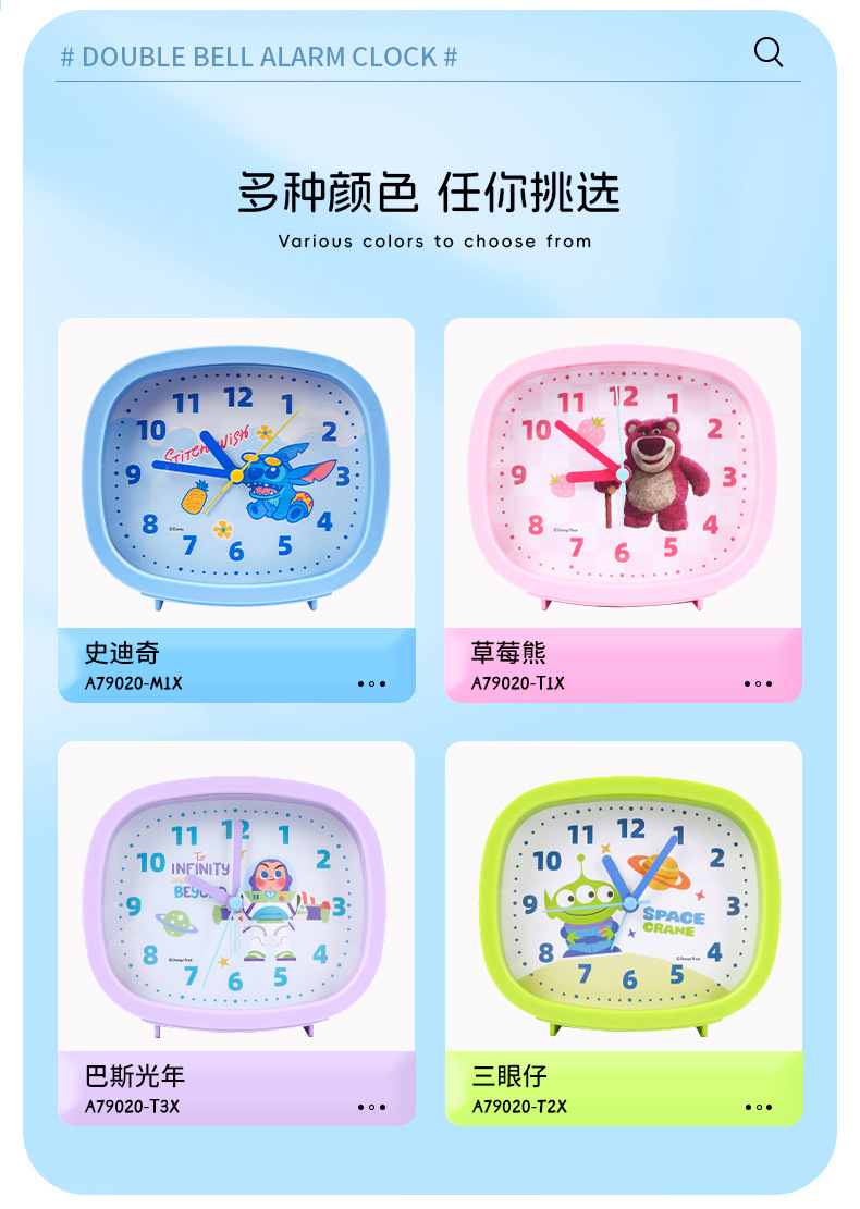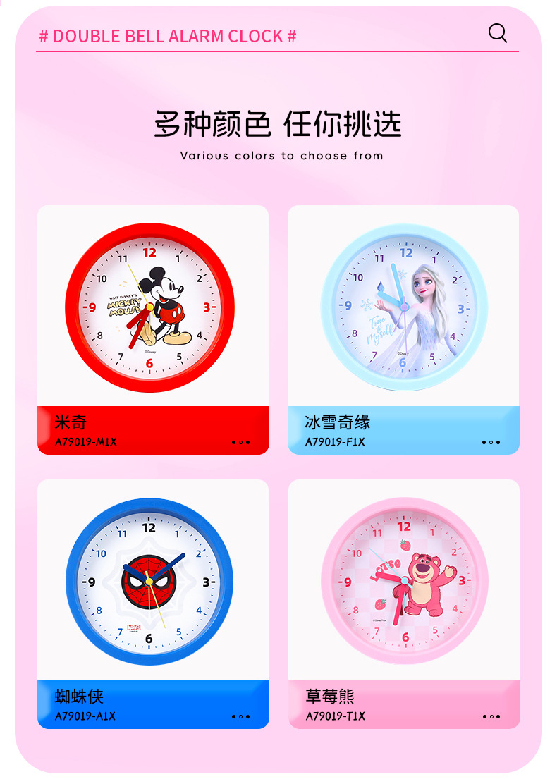 カラー A79019円形静音目覚まし時計/ミッキー,A79019円形静音目覚まし時計/スパイダーマン,A79020角型静音目覚まし時計/いちご熊,A79020角型静音目覚まし時計/バス光年,A79020角型静音目覚まし時計/スティッチ