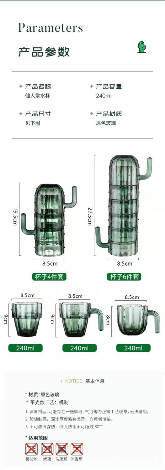 新家用仙人掌玻璃水杯六件套四件套杯可叠放网红礼品杯茶杯牛奶杯